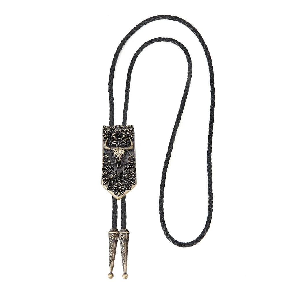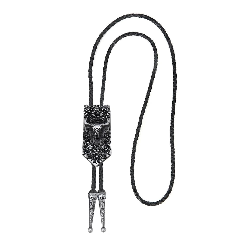 Ge din outfit ett ikoniskt uttryck med denna iögonfallande Bolo tie i svart flätat läder, prydd med en mäktig oxskalle och delikata blomdetaljer i metall. Ett accessoarval för dig som älskar western-stil med en touch av gotisk konstnärlighet.