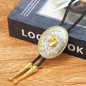 Upptäck ett smycke som säger mer än tusen ord. Denna bolo tie med ett skulpterat hästhuvud i tvåfärgad metall är inte bara ett tillbehör – det är en hyllning till frihet, styrka och personlig stil.