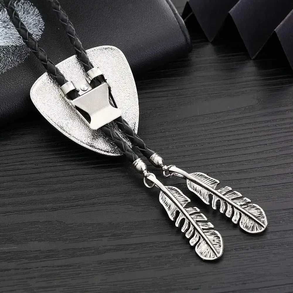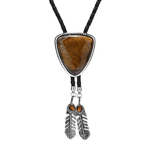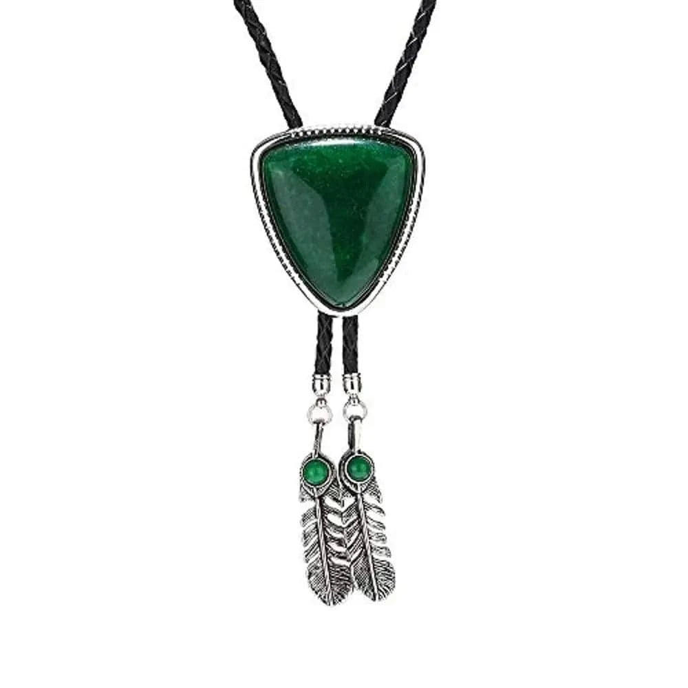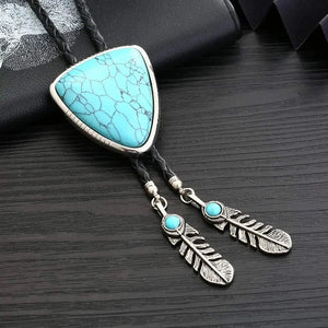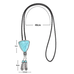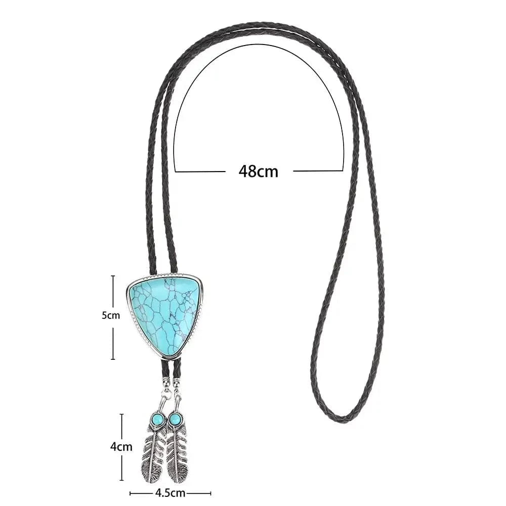 Vill du bära något som både sticker ut och känns personligt? Denna bolo tie med triangelformad medaljong, naturlig sten och dekorativa fjädrar är ett konstnärligt smycke som för tankarna till både westernkultur och indianskt hantverk – perfekt för både kvinnor och män.