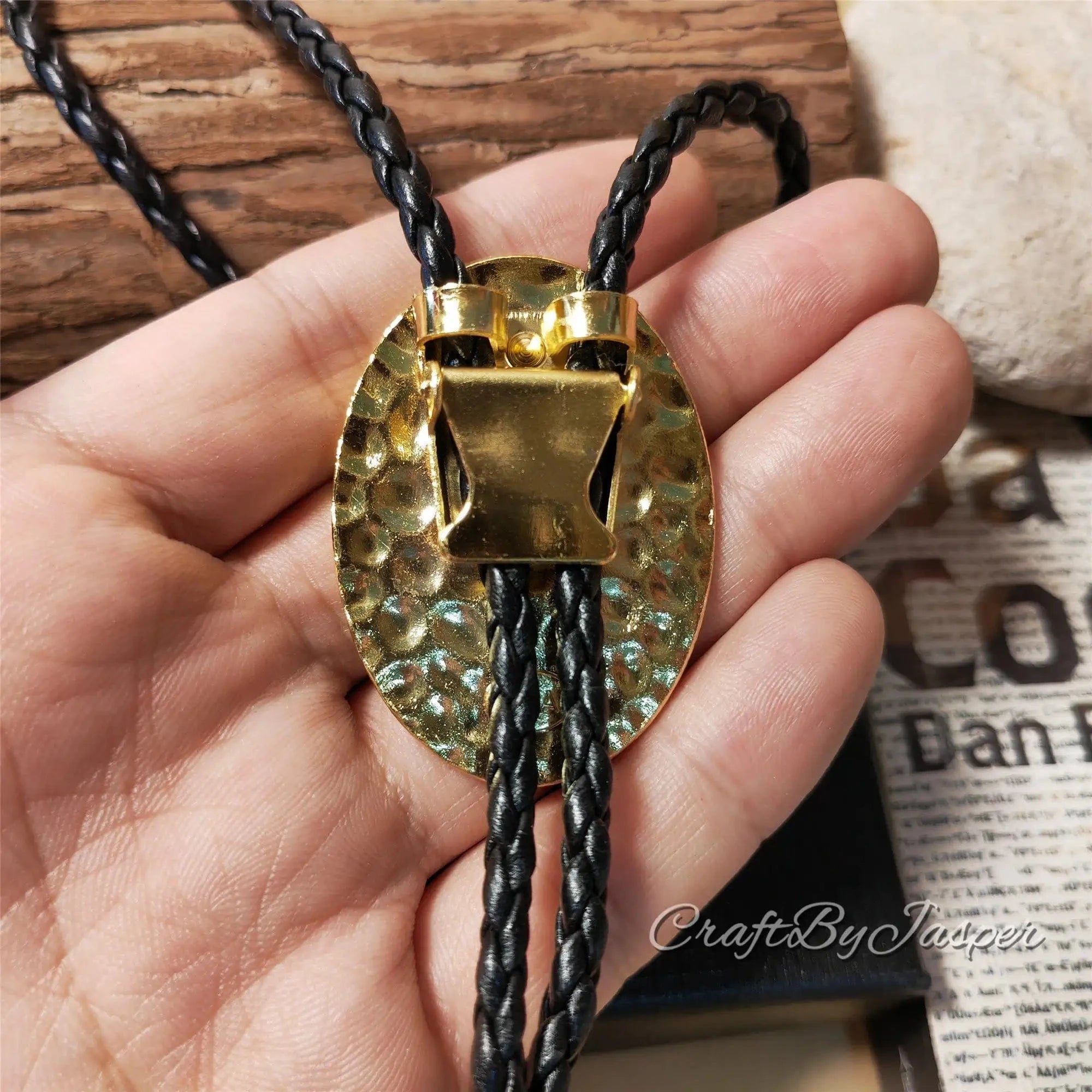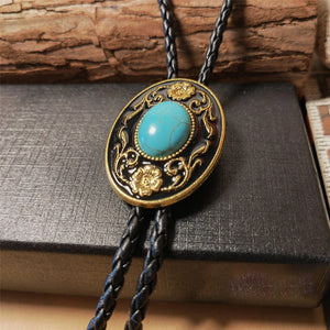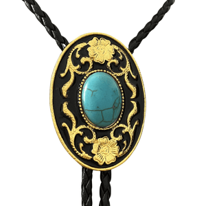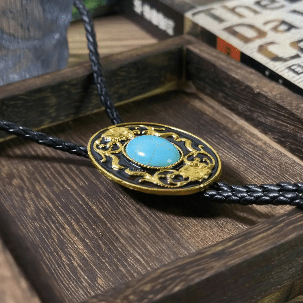 Låt din outfit tala med denna iögonfallande och konstnärligt utformade bolo tie. Den ovala medaljongen med gyllene mönster ramar in en slående blå sten som för tankarna till vintage västern och tidlös klass.