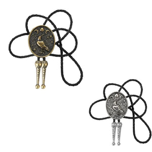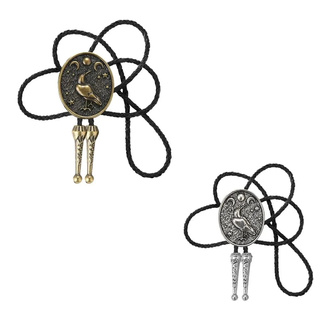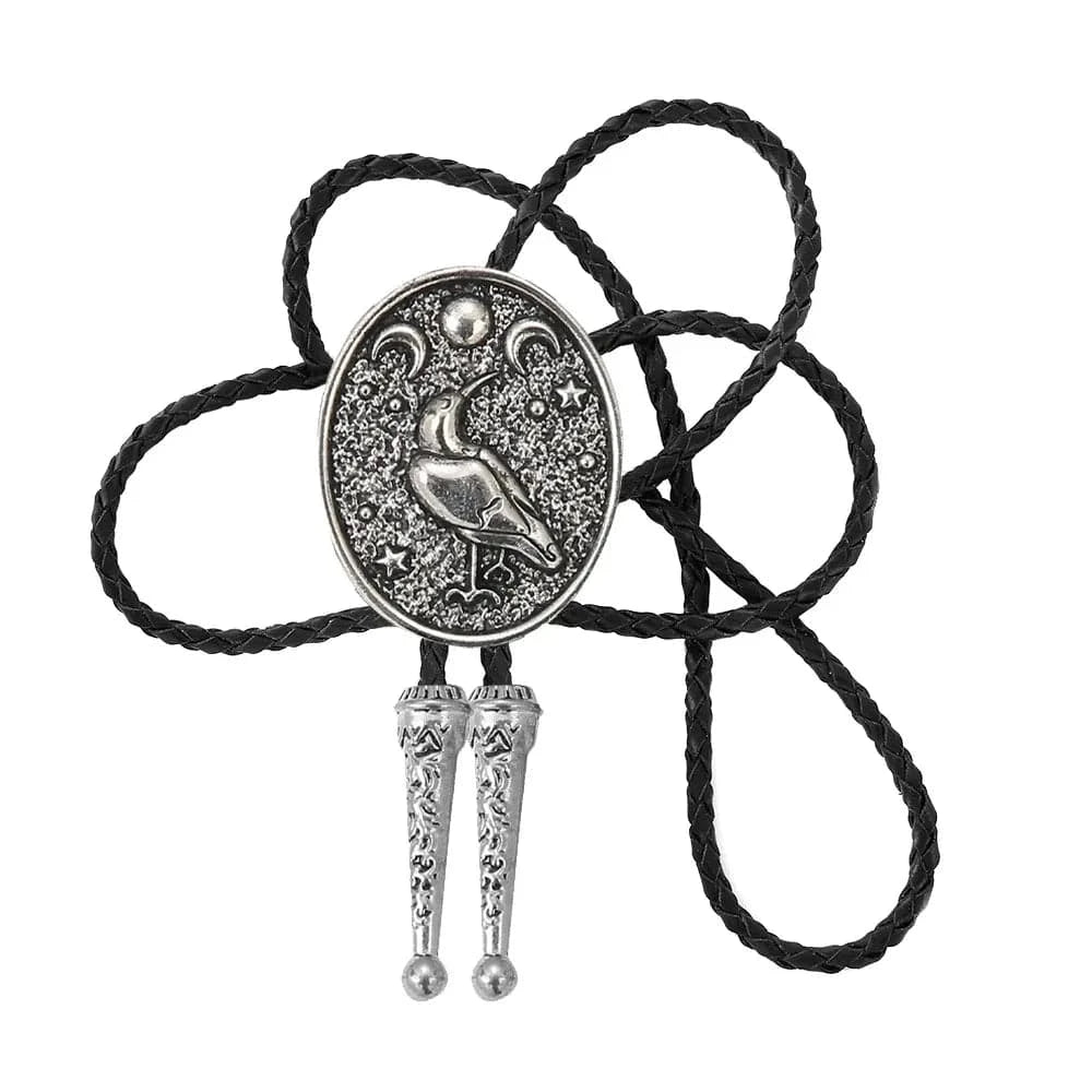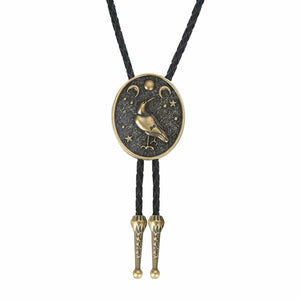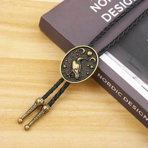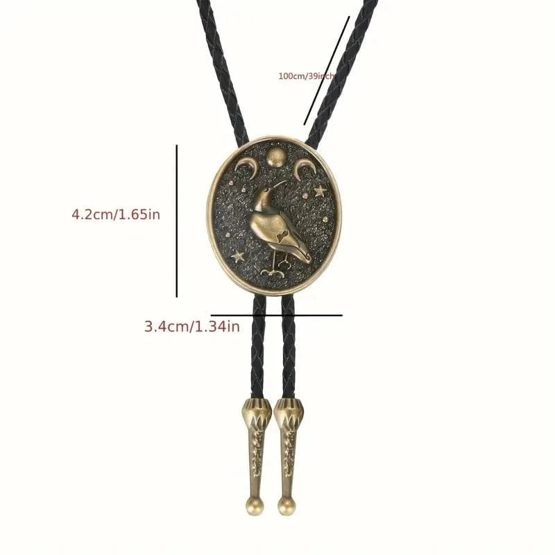 Den här bolo tie i antik stil med en elegant fågel mot stjärnhimmel och måne är ett unikt smycke som kombinerar mytologi, natur och västernromantik. Med sin svartguldiga eller silvriga yta är den både kraftfull och subtil – perfekt för dig som gillar detaljer med innebörd.