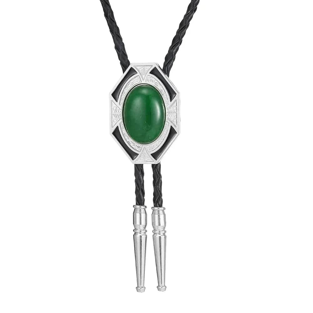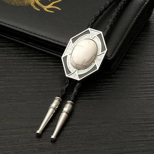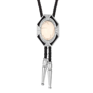 Oavsett om du bär den till skjorta, väst eller som ett uttrycksfullt smycke, ger denna bolo tie en touch av individualitet. Den flätade läderremmen och glänsande stenen ramas in av en detaljrik infattning i zinklegering som fångar både ljus och blickar.