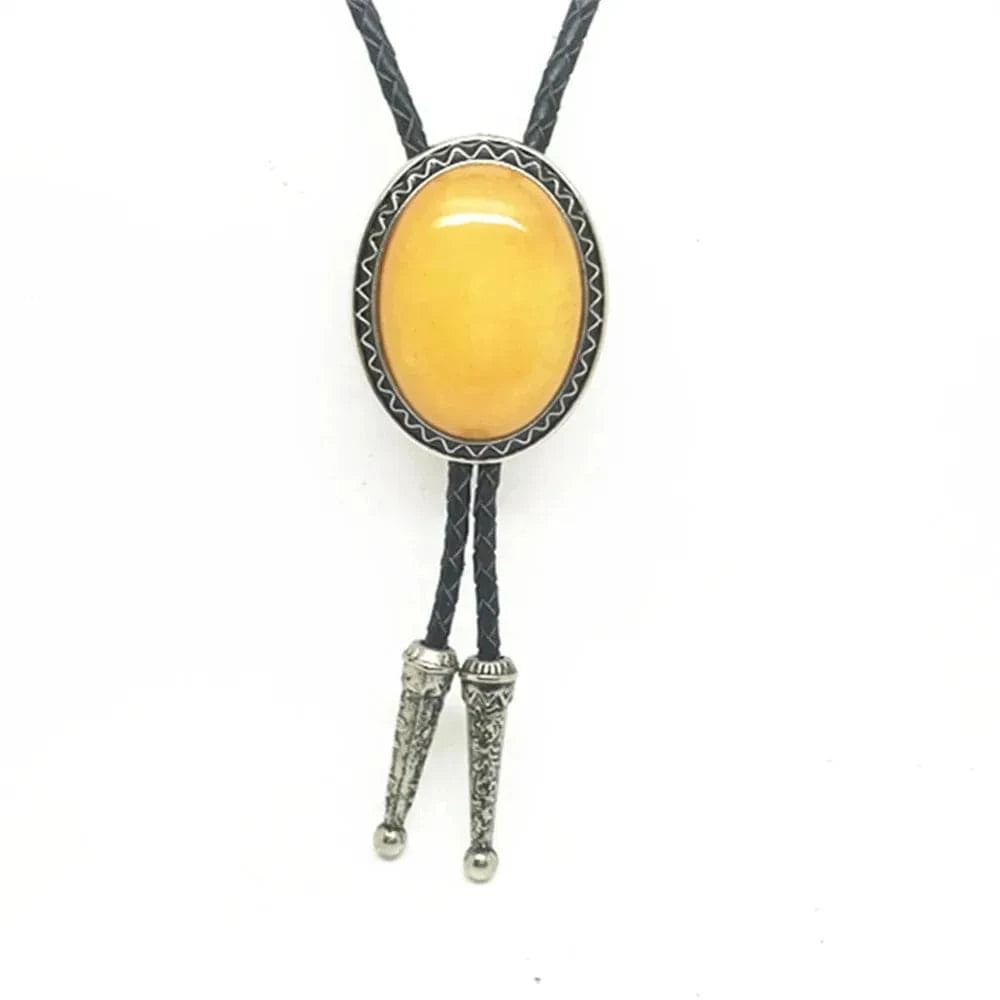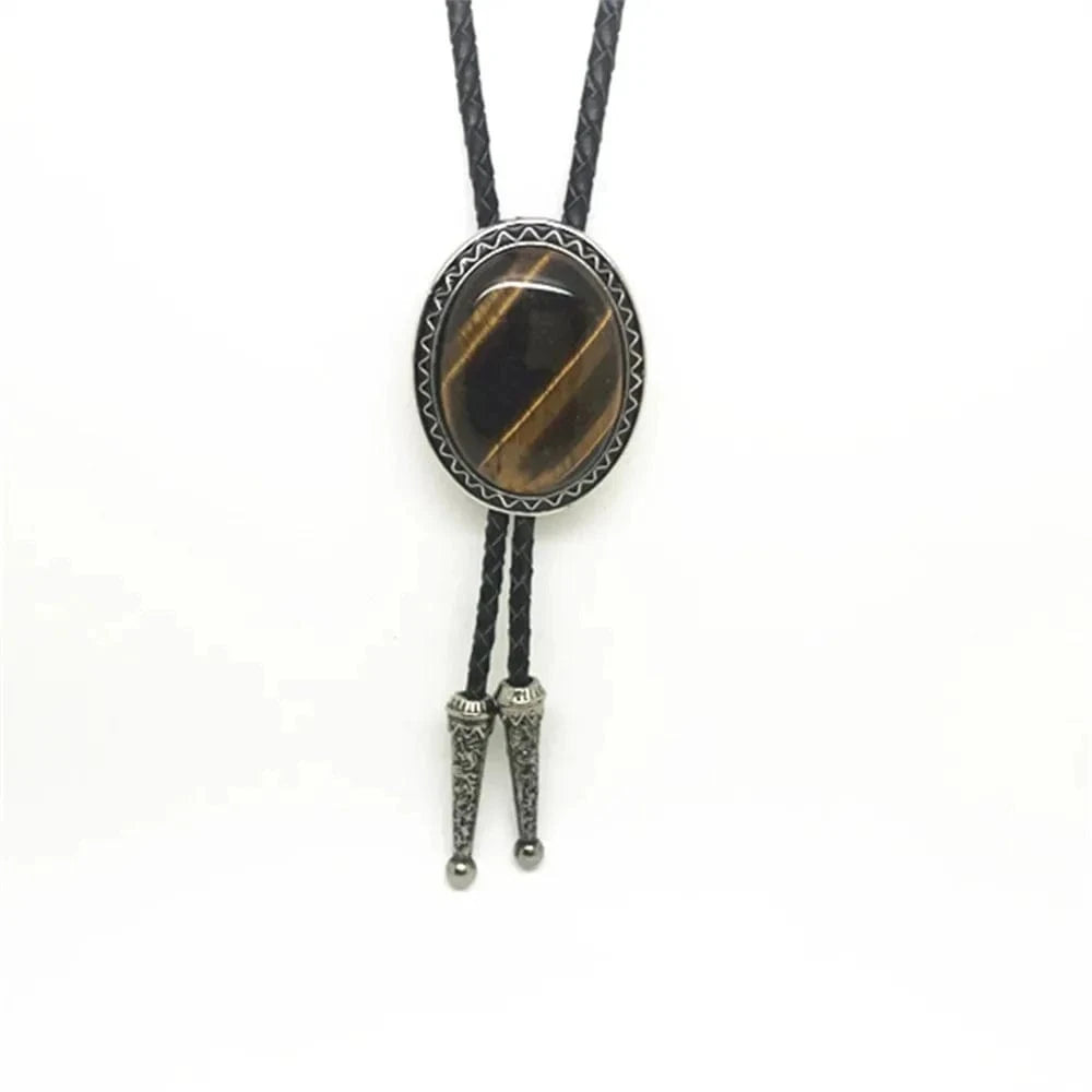 Sätt pricken över i:et på din outfit med denna eleganta bolo tie i genuint läder och ovalt hänge – prydd med färgrik glasdetalj och metalliska avslut. Perfekt för både vardag och fest.