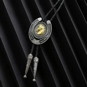 Letar du efter en accessoar som fångar både styrka och stil? Den här bolo tie med upphöjt hästmotiv i en U-formad ram är ett djärvt smycke som hyllar westernkulturen och ger din outfit personlighet.