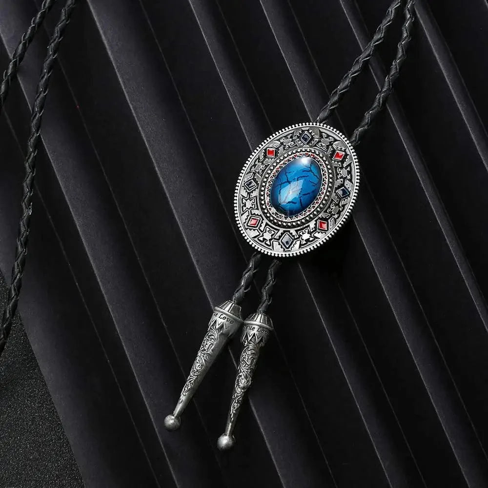 Utforska en accessoar som för tankarna till både tradition och modern elegans. Denna bolo tie kombinerar dekorativ metall med en djup, gnistrande oval sten – perfekt för att ge din outfit ett stilfullt lyft.