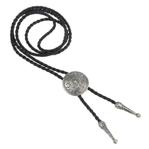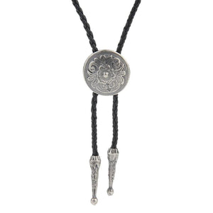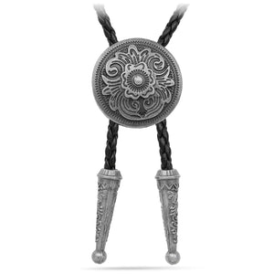 Med ett vackert ingraverat blommönster i antiksilver ger denna bolo tie ett tidlöst och konstnärligt uttryck. Den runda medaljongen har en distinkt vintagekänsla som kompletteras perfekt av den svarta flätade remmen och de prydligt dekorerade spetsarna i metall.