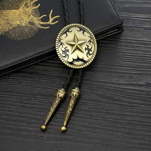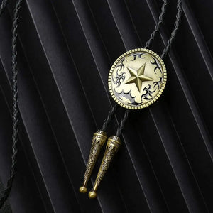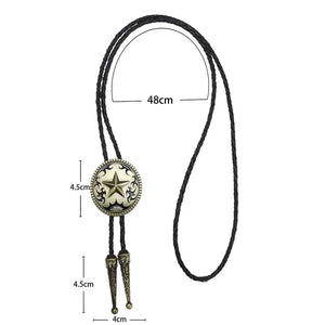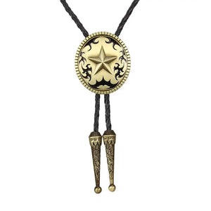 Ge din outfit en dos vilda västern-karaktär med denna handgjorda bolo tie i zinklegering. Med sin tydliga stjärnsymbol och utsökta gravyr i både guld- och silvertoner är detta ett accessoarval som förmedlar styrka, stil och personlighet.