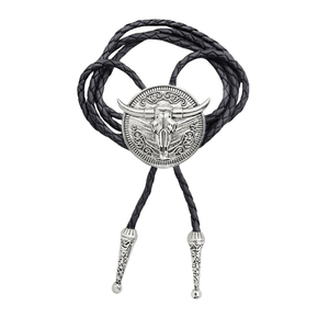 Med ett mäktigt tjurhuvud i silverfärgad legering i centrum för denna bolo tie får du ett smycke som förmedlar styrka, frihet och tradition. Den runda medaljongen pryds av snirkliga detaljer och kompletteras av en svart flätad rem samt ornamenterade metallspetsar.