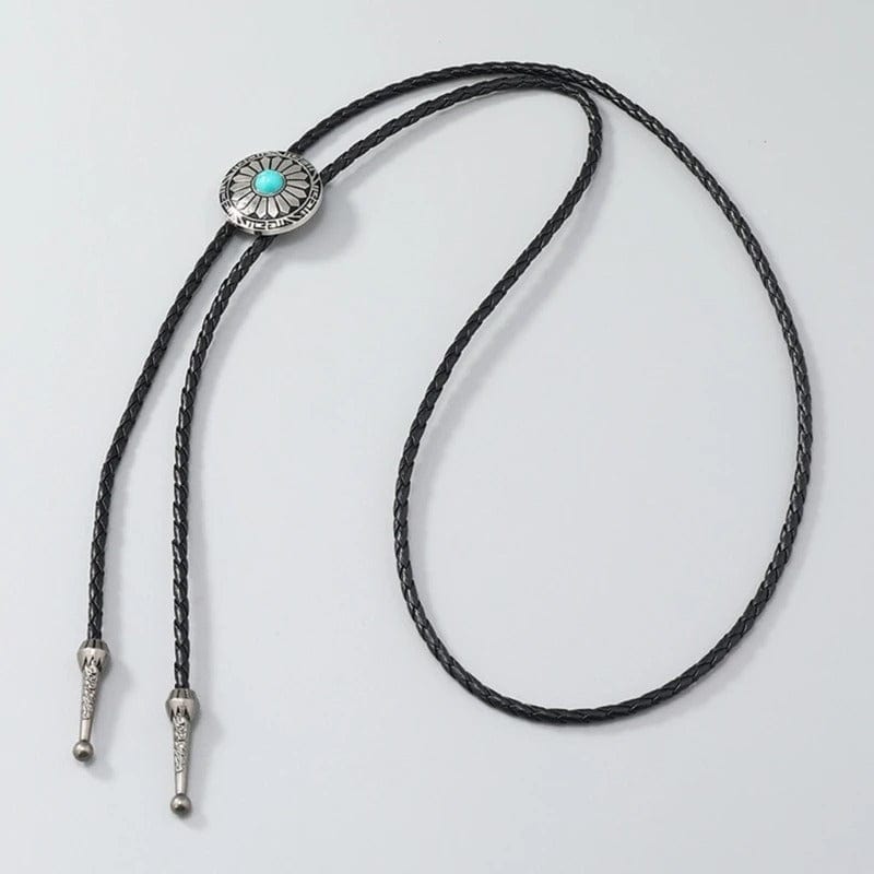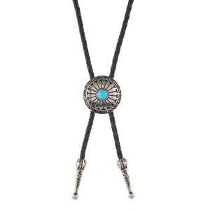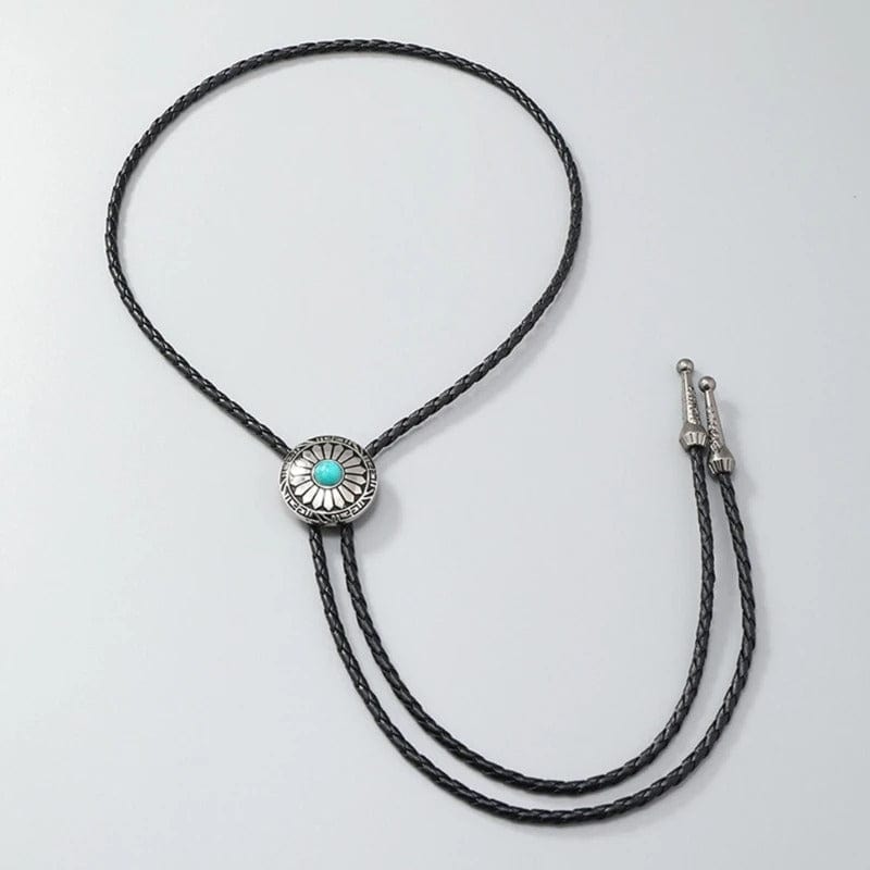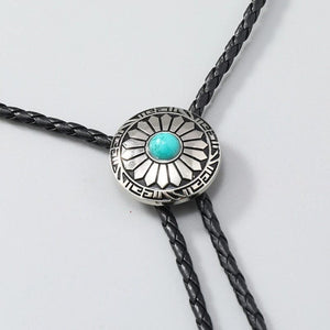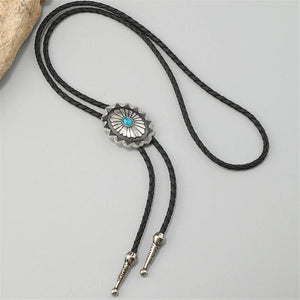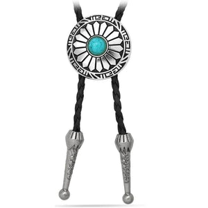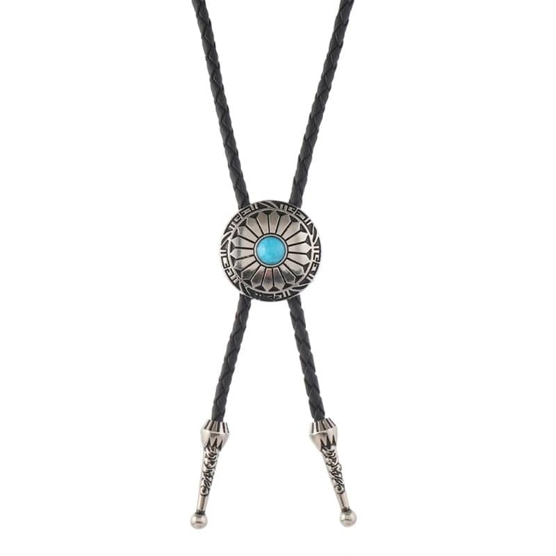 En accessoar med själ: denna bolo tie kombinerar den kraftfulla symboliken hos solen med en turkos mittpunkt som lyser upp varje outfit. Det runda hänget i silverlegering är prytt med geometriskt solmönster och inramat med dekorativa linjer i etnisk stil.