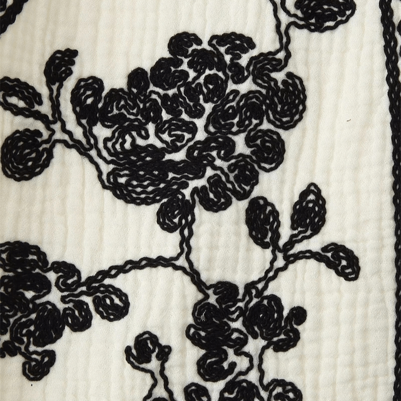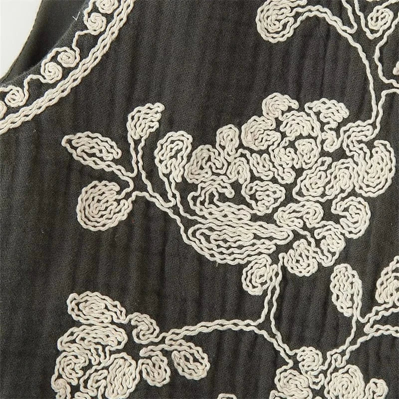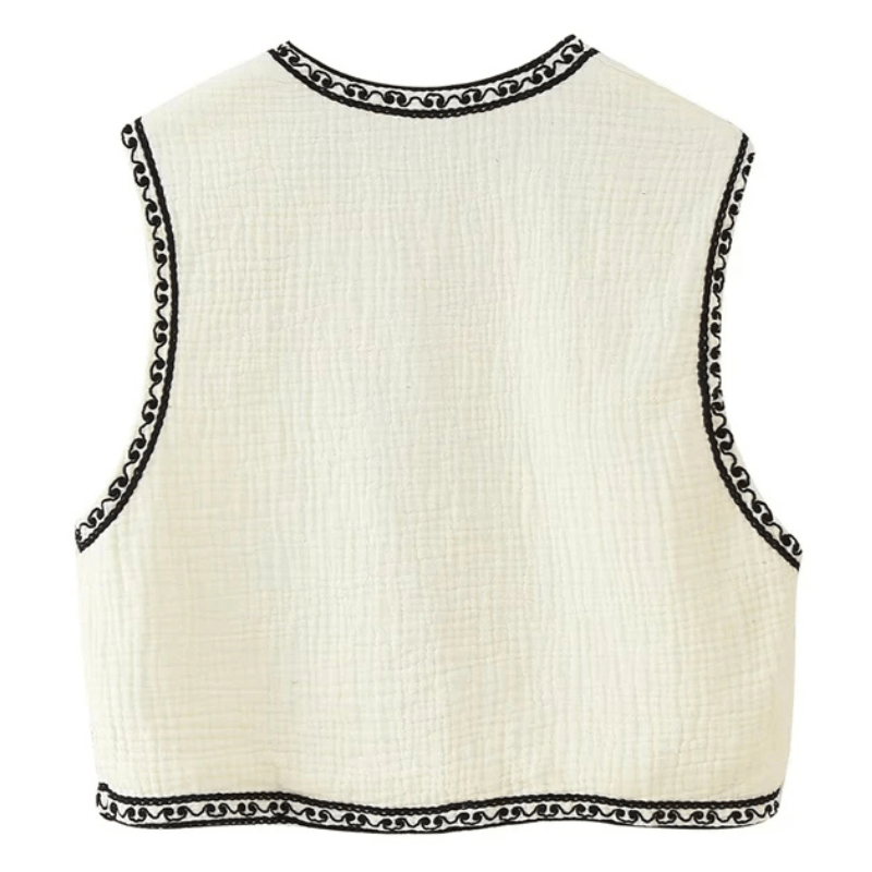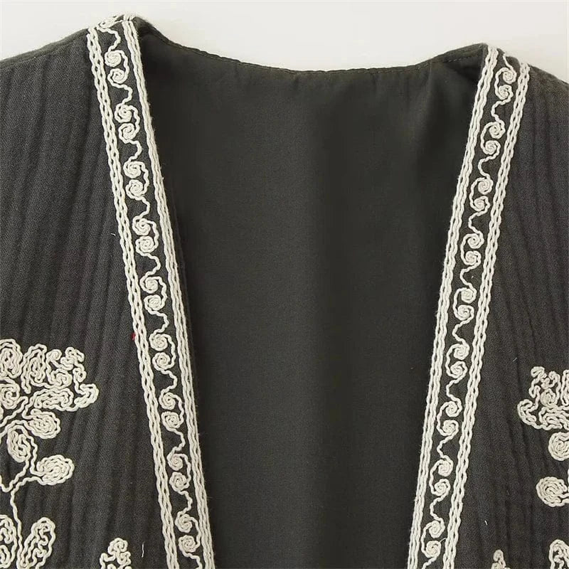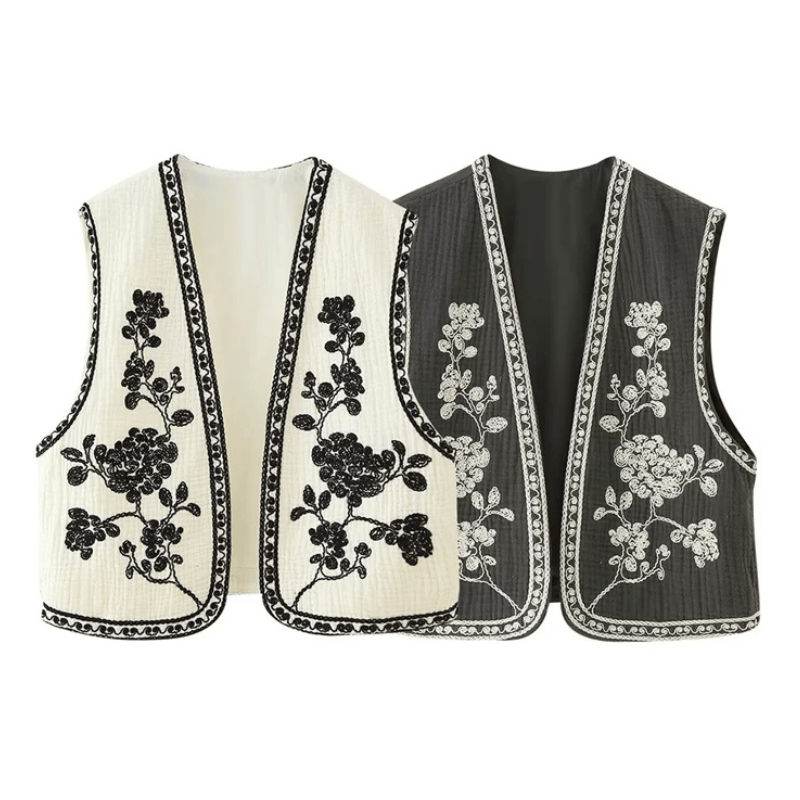 Låt din stil blomma med denna broderade väst som kombinerar svartvita kontraster med tidlös vintagecharm. Perfekt för dig som vill addera en bohemisk och samtidigt sofistikerad känsla till din garderob.