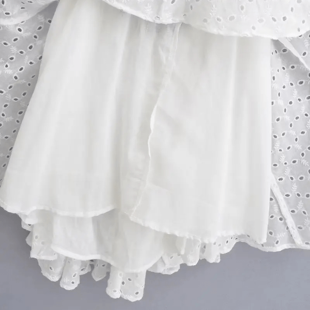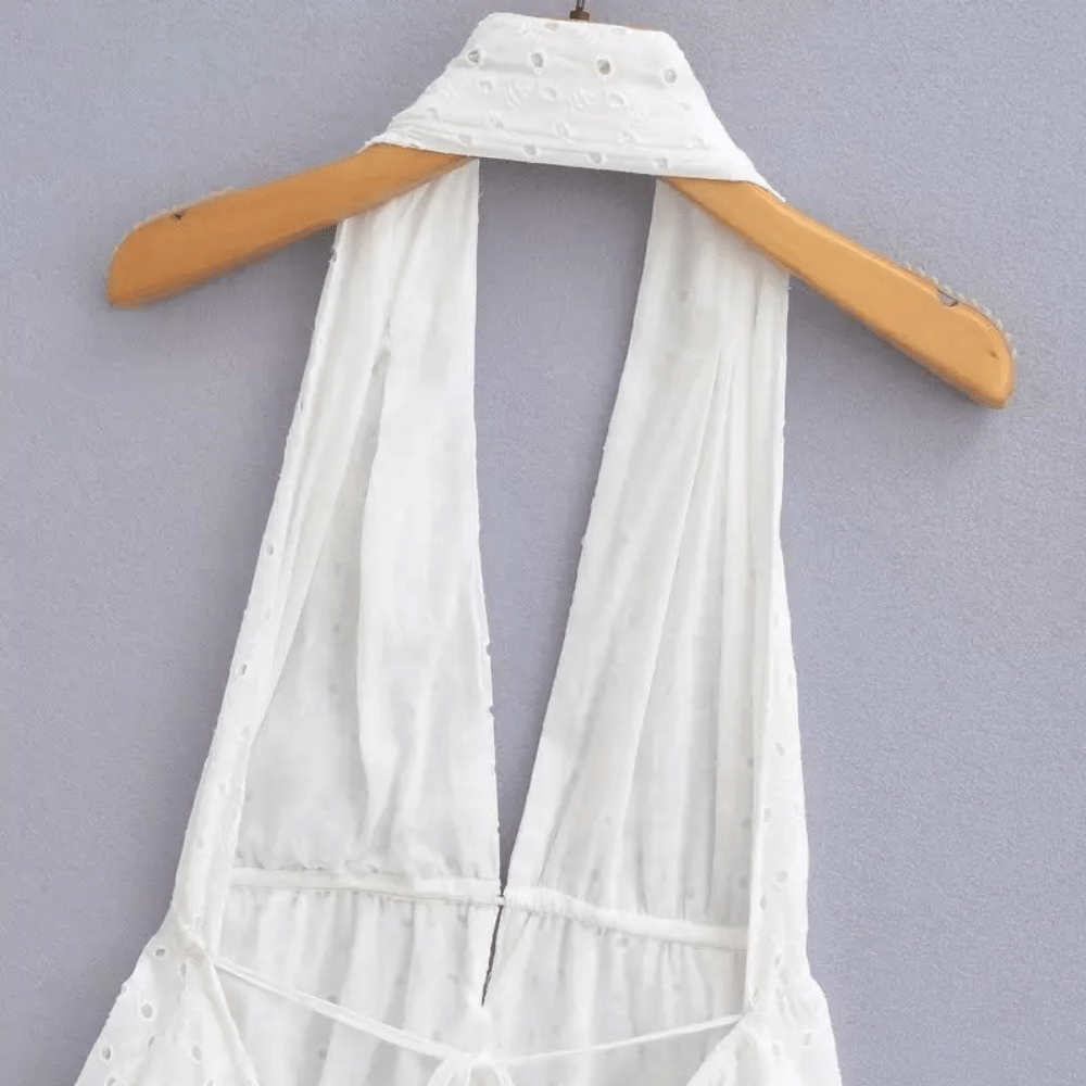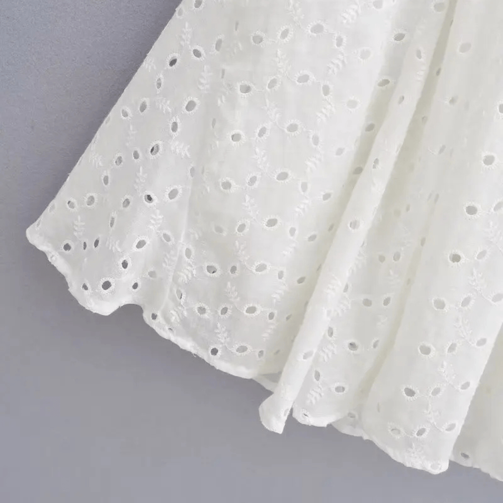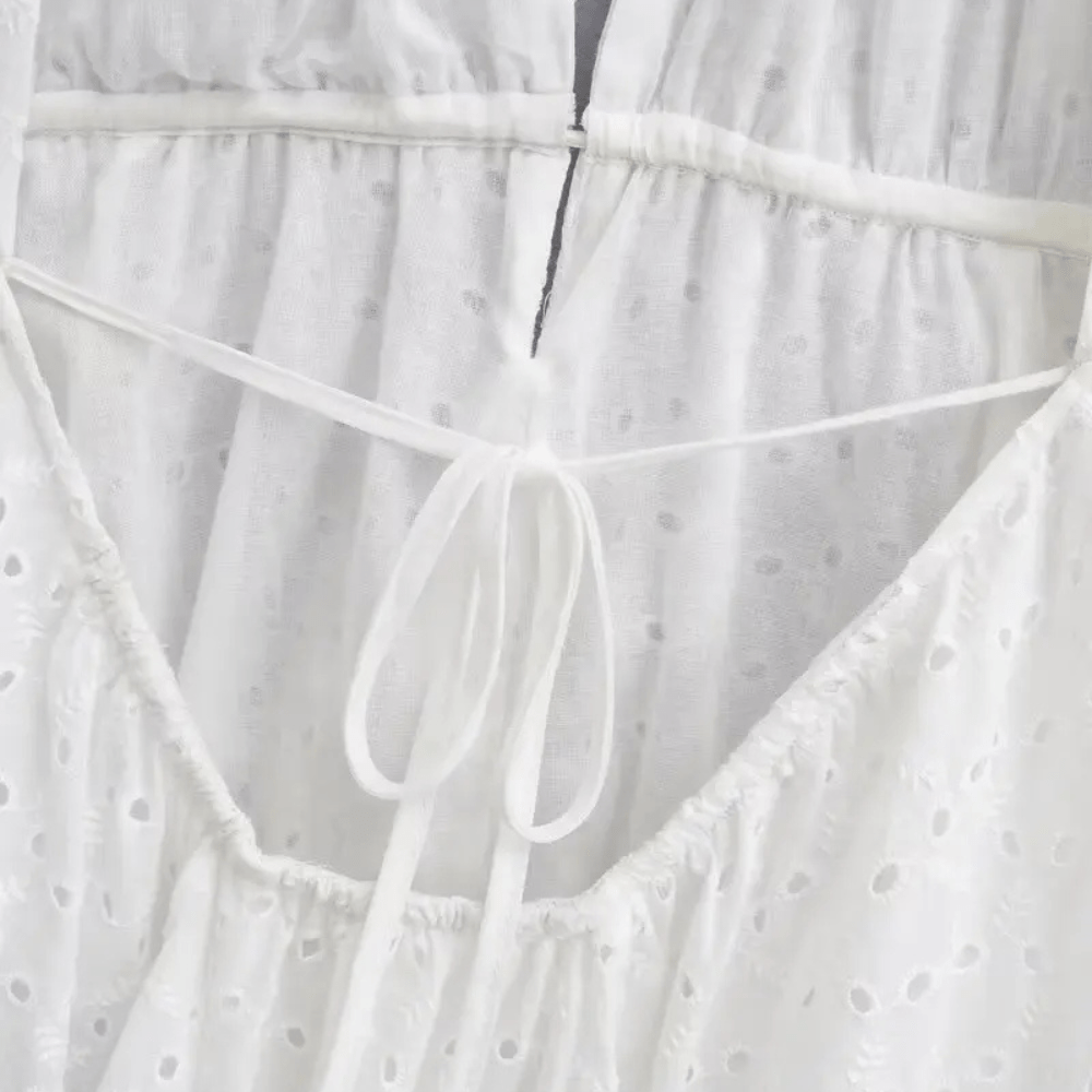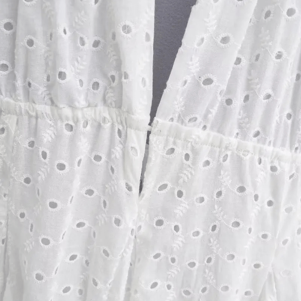 Låt sommaren bli oförglömlig med vår vita broderade klänning. Ett luftigt och romantiskt plagg som kombinerar bohemisk charm med en modern, sofistikerad stil.