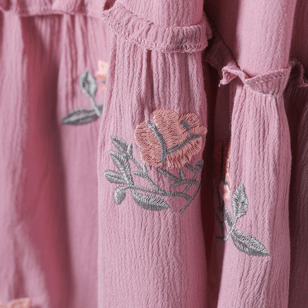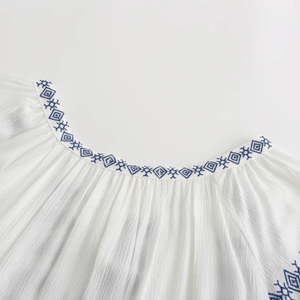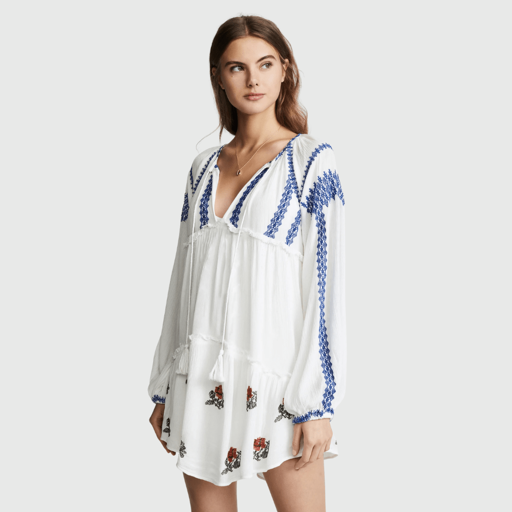 Broderad miniklänning i boho-stil med ballongärm och fransar