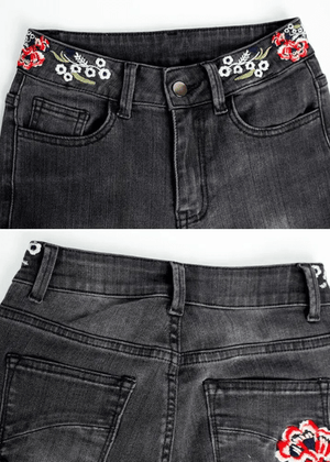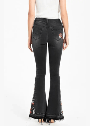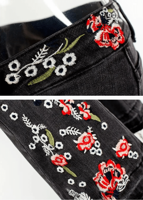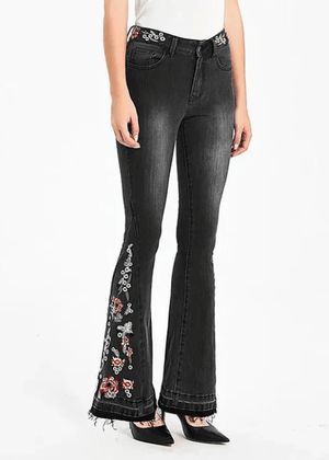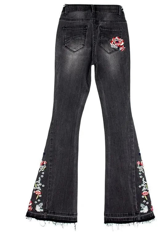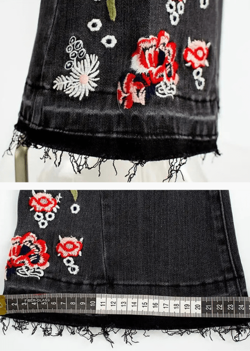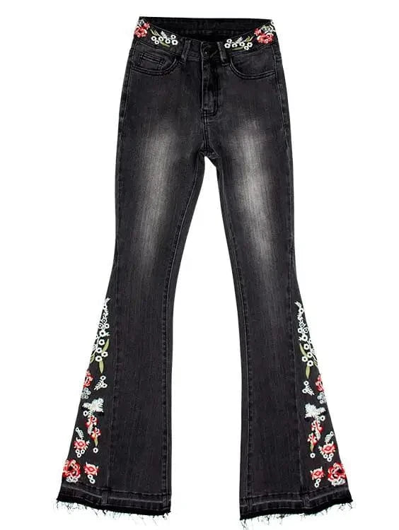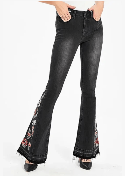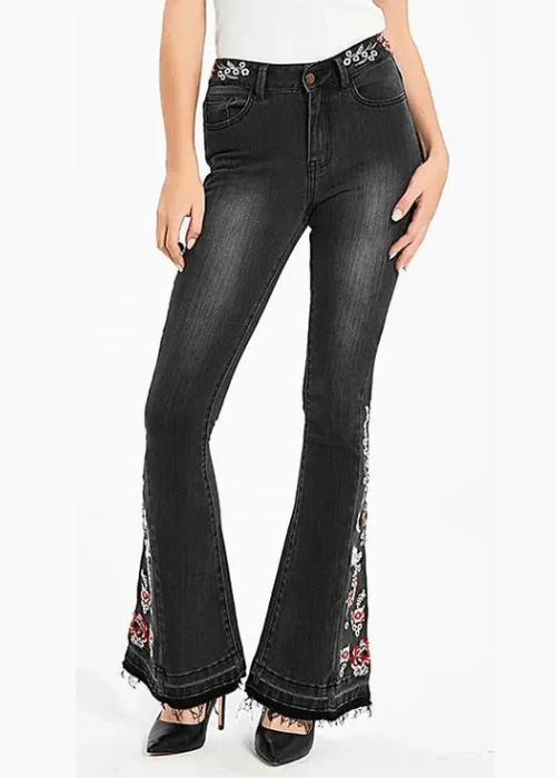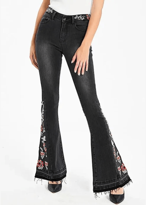 Broderade svarta flare jeans med blommönster – när retro möter romantik