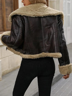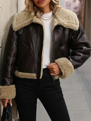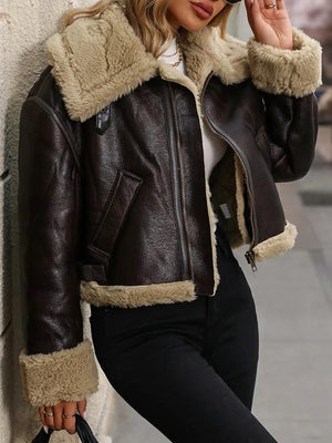 Ge din höst- och vintergarderob en uppgradering med denna lyxigt mjuka shearlingjacka i brun konstläder. Perfekt för dig som vill ha en klassisk westernkänsla med en modern, feminin touch.