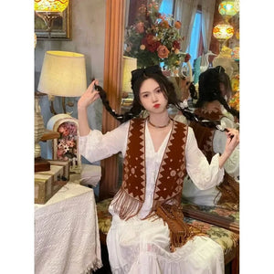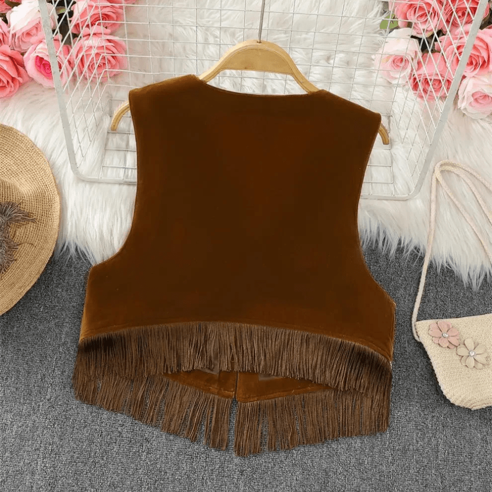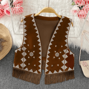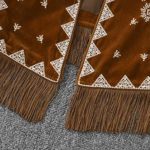 Lyft din stil med denna unikt broderade väst i varm brun ton, prydd med fransar som rör sig mjukt i takt med dina steg. Perfekt för dig som vill addera en sofistikerad boho-touch till både vardag och fest.