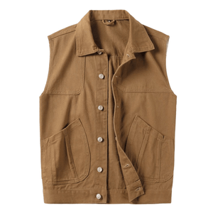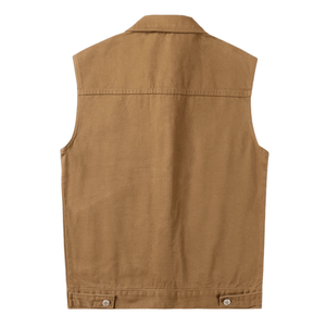 Upptäck en tidlös väst som kombinerar westernkänsla med modern funktion. Den här bruna canvasvästen är din perfekta följeslagare för både vardag och äventyr – slitstark, bekväm och alltid stilsäker.