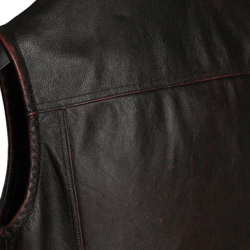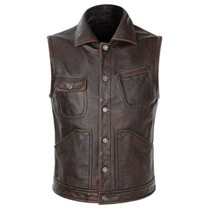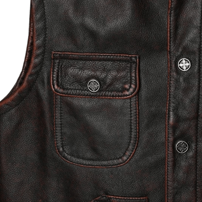 Känn vinden mot huden och doften av läder när du kliver in i rollen som en sann westernhjälte. Denna bruna skinnväst i vintage-look är designad för att ge dig både attityd och komfort – perfekt för ridturer, motorcykeläventyr eller avslappnade dagar i stan.