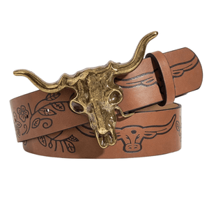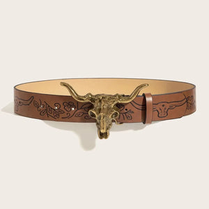 Låt din stil tala med ett westernbälte i brun PU-läder och kraftfull tjurskalle