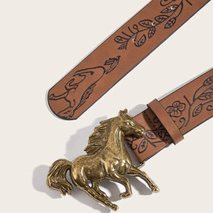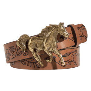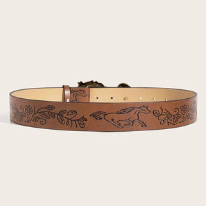 Det här unisexbältet kombinerar rustik charm och uttrycksfull design i ett och samma accessoar. Den detaljerade mässingsfärgade hästspännet framhäver bältets westerninfluenser och ger direkt karaktär till din look.