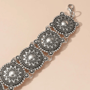 Lyft din stil med detta statement-smycke som kombinerar klassisk western-estetik med tidlös elegans. Med sina antika guld- och silvernyanser blir det en perfekt detalj för dig som vill sticka ut.