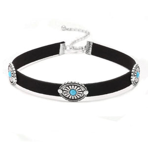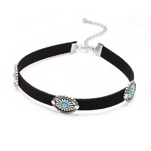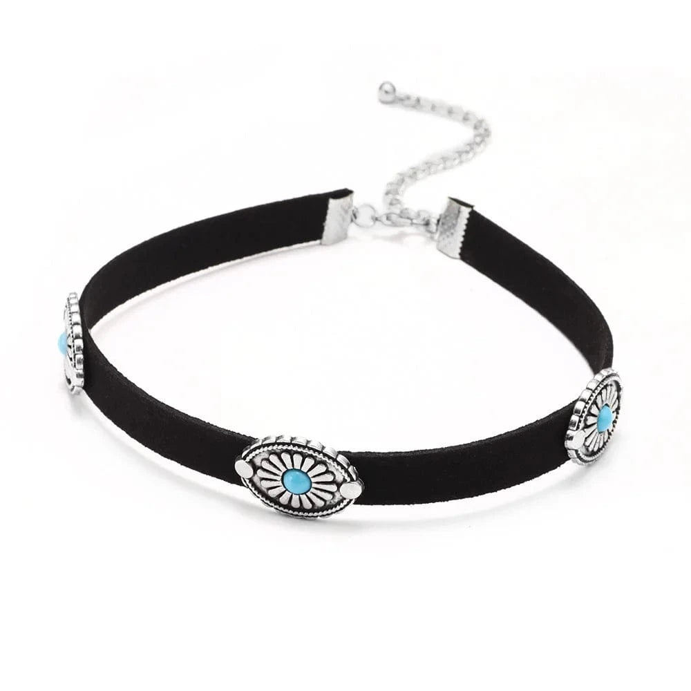 Ge din outfit en djärv, autentisk känsla med denna choker i läder prydd med turkosfärgade conchos. Perfekt för dig som vill kombinera western-estetik med feminin elegans.