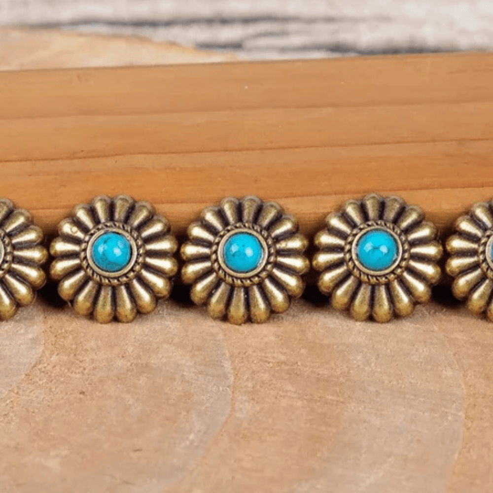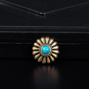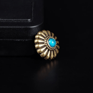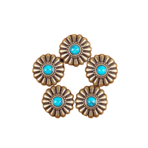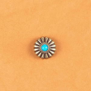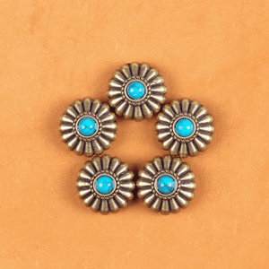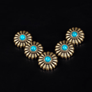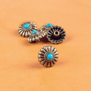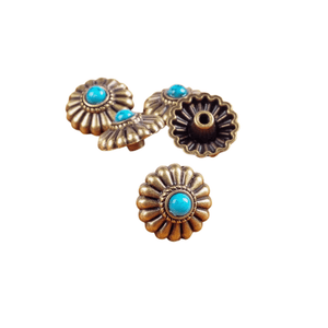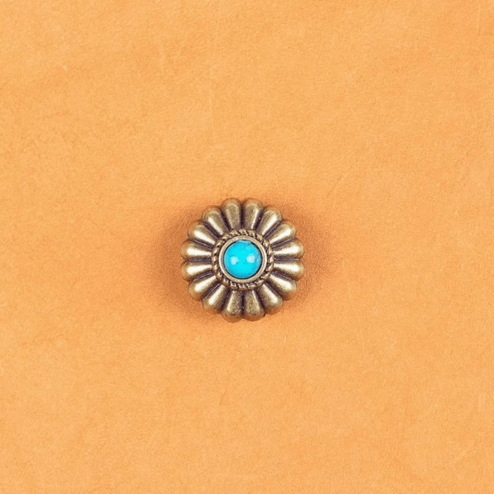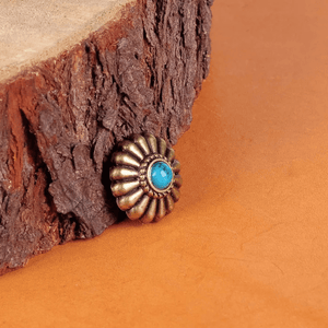 Letar du efter det lilla extra som förvandlar ditt läderhantverk? Denna dekorativa concho i antik mässing med turkosfärgad sten ger din väska, sadel eller bälte en elegant westernkänsla med vintage charm.