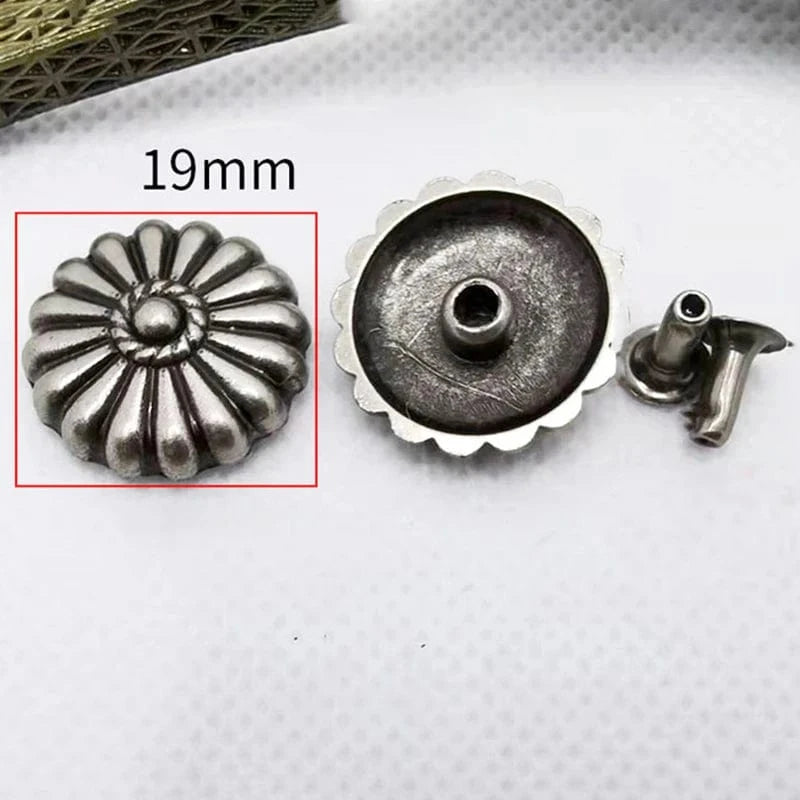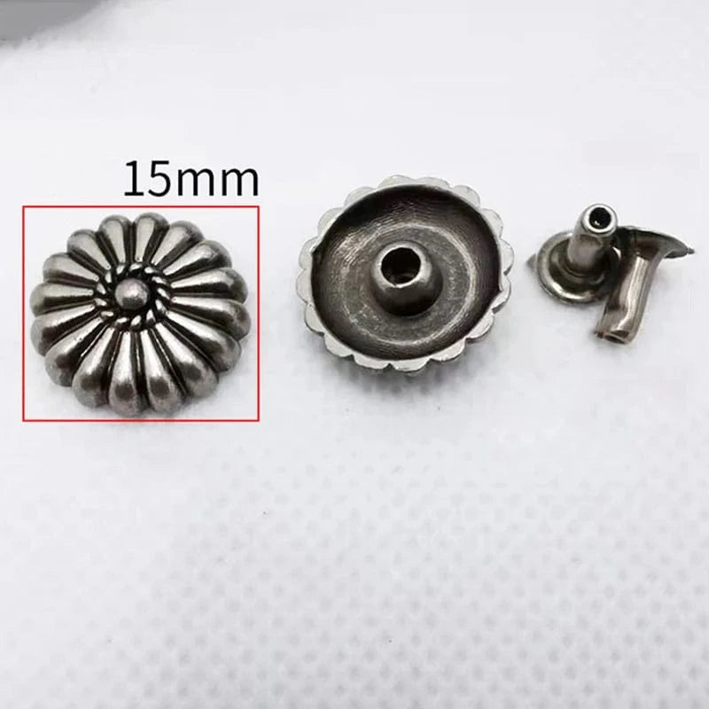 Lyft dina läderprojekt med dessa eleganta conchos i antiksilver. Med sin blommiga form och robusta metallkonstruktion ger de både karaktär och hållbarhet till bälten, väskor, armband eller jackor.