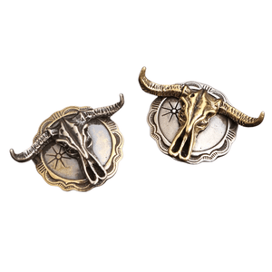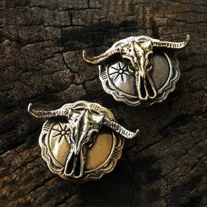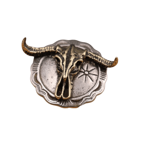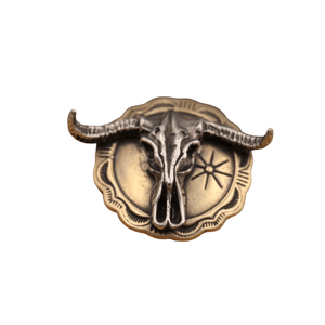 Fånga den ikoniska västernkänslan med denna unika concho i form av en buffelskalle. Med handgraverade detaljer, breda horn och en rund, dekorativ bakgrund, är den designad för att ge karaktär till allt från läderbälten till boots och väskor.