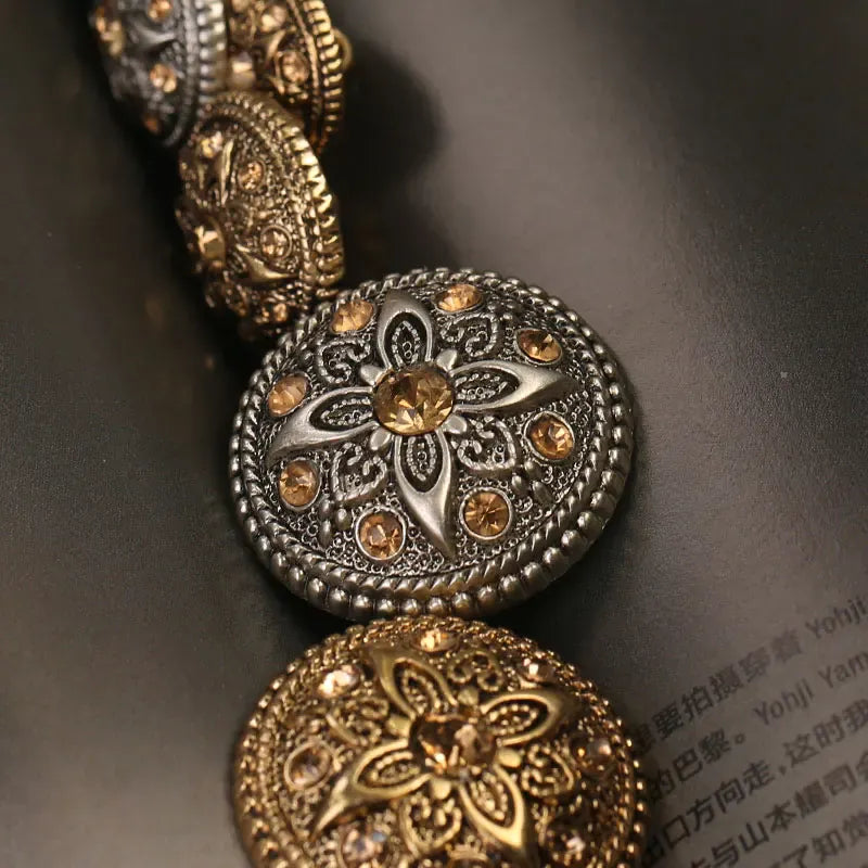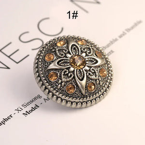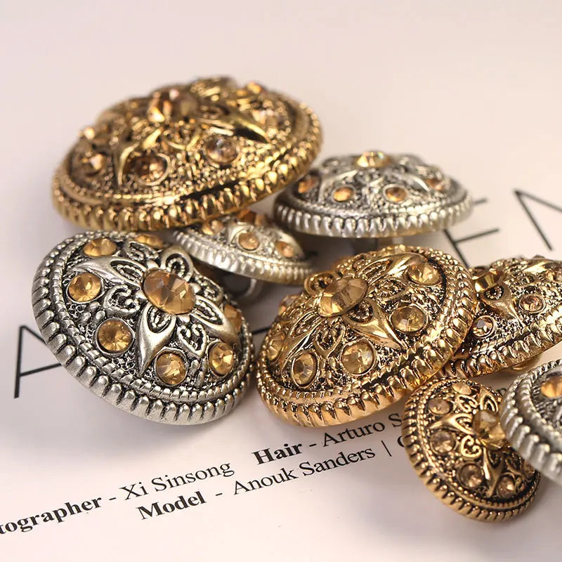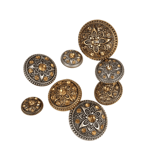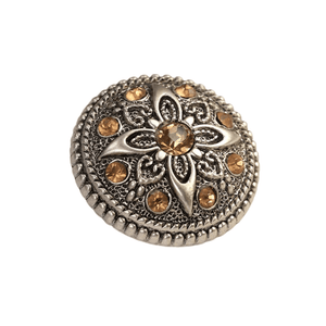 Ge dina plagg en autentisk westernkänsla med dessa eleganta concho-knappar med graverad blomma. Varje knapp är rikligt dekorerad med små rhinestones och har en vacker, antik finish som förvandlar även den enklaste jacka, kjol eller väst till något riktigt speciellt. Perfekt för dig som älskar detaljer som känns både rustika och lyxiga.