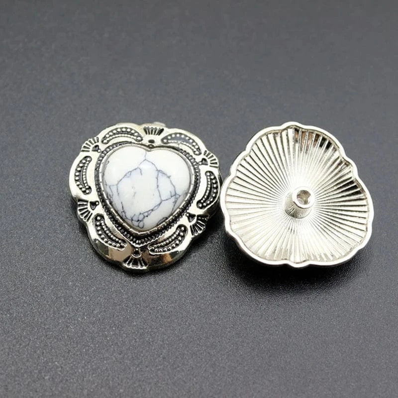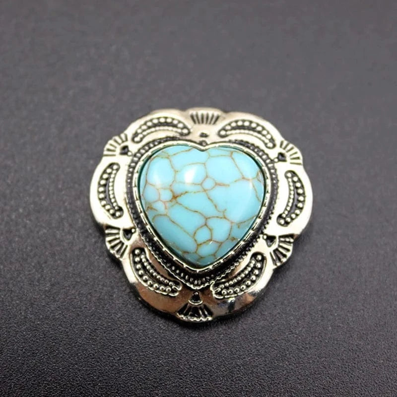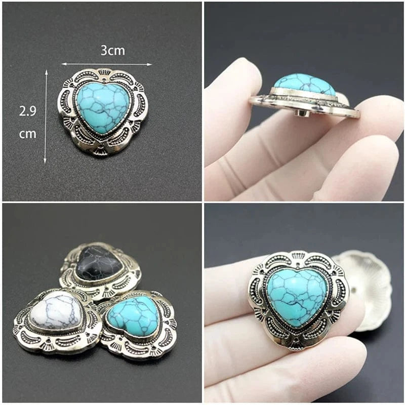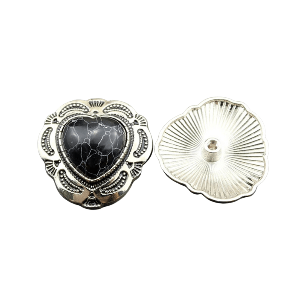Vill du ge din väska, plånbok eller bälte en personlig och romantisk touch? Den här hjärtformade conchon med sten i turkos, svart eller vit är både vacker och funktionell – perfekt för att uttrycka din stil.