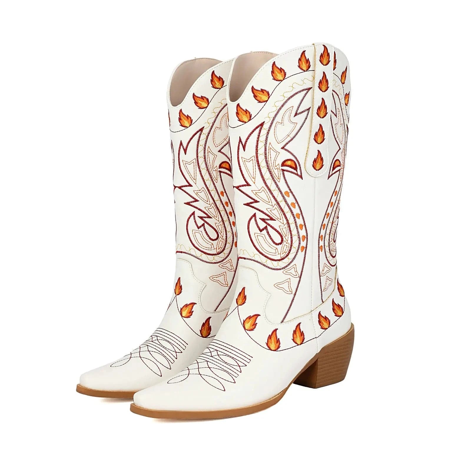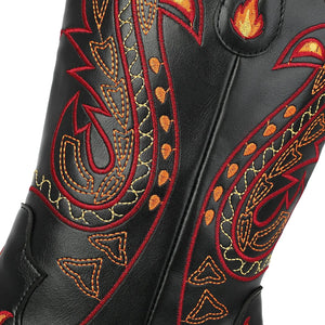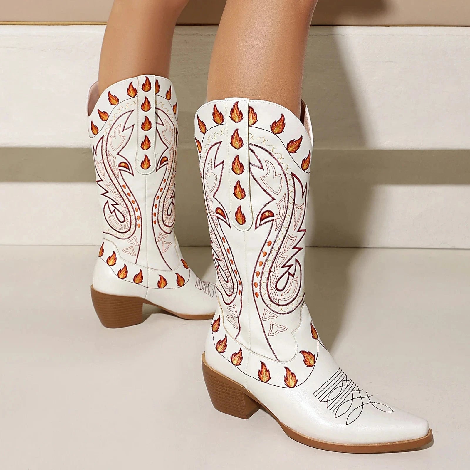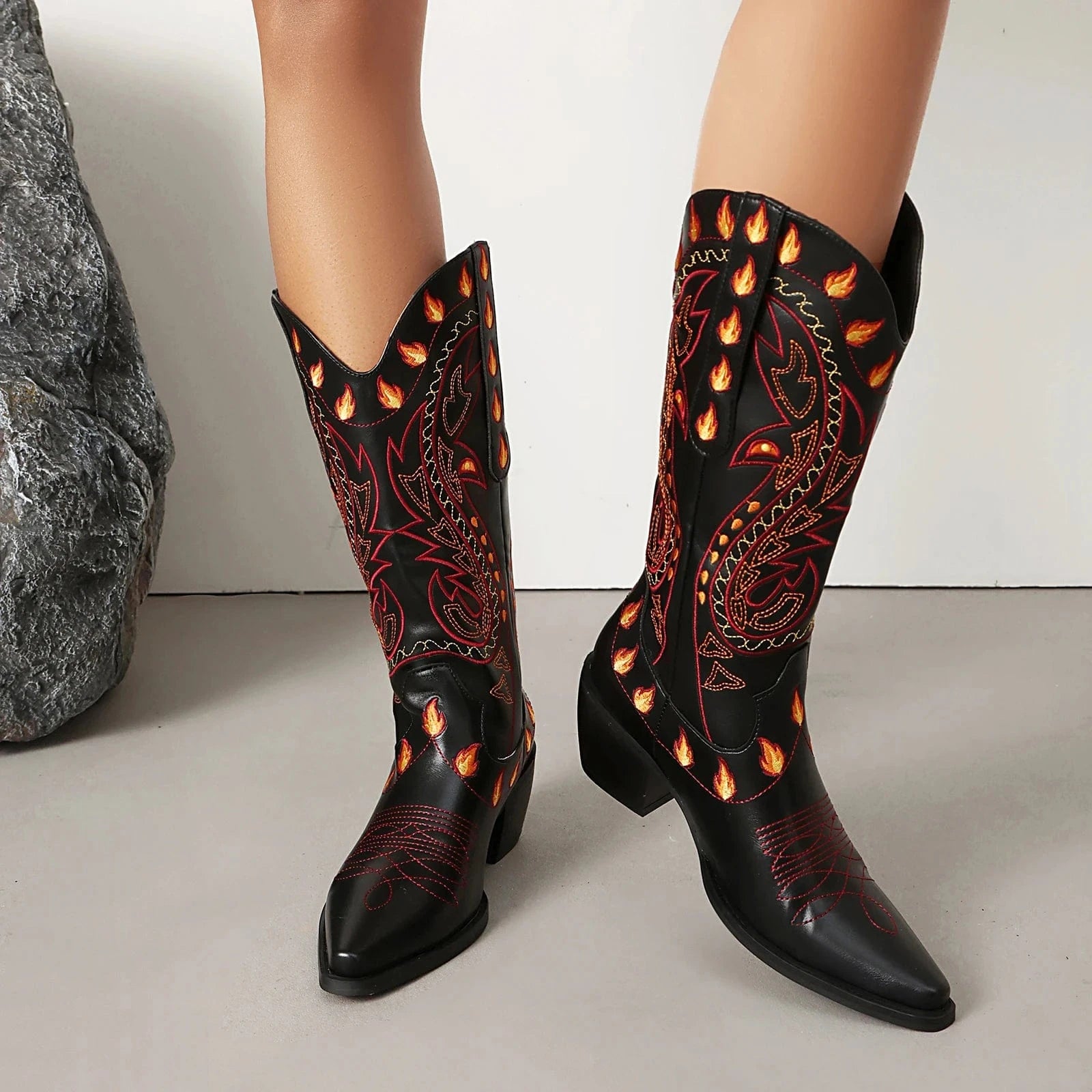 Låt din stil tala med våra cowboyboots med flammande broderier, tillgängliga i både svart och vitt. De kombinerar klassisk westernkänsla med en modern, självsäker look – perfekta för dig som vill ha både attityd och elegans. Bär dem till jeans, klänning eller kjol och skapa en outfit som andas frihet och karaktär.