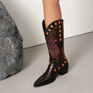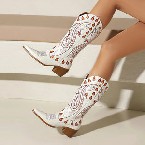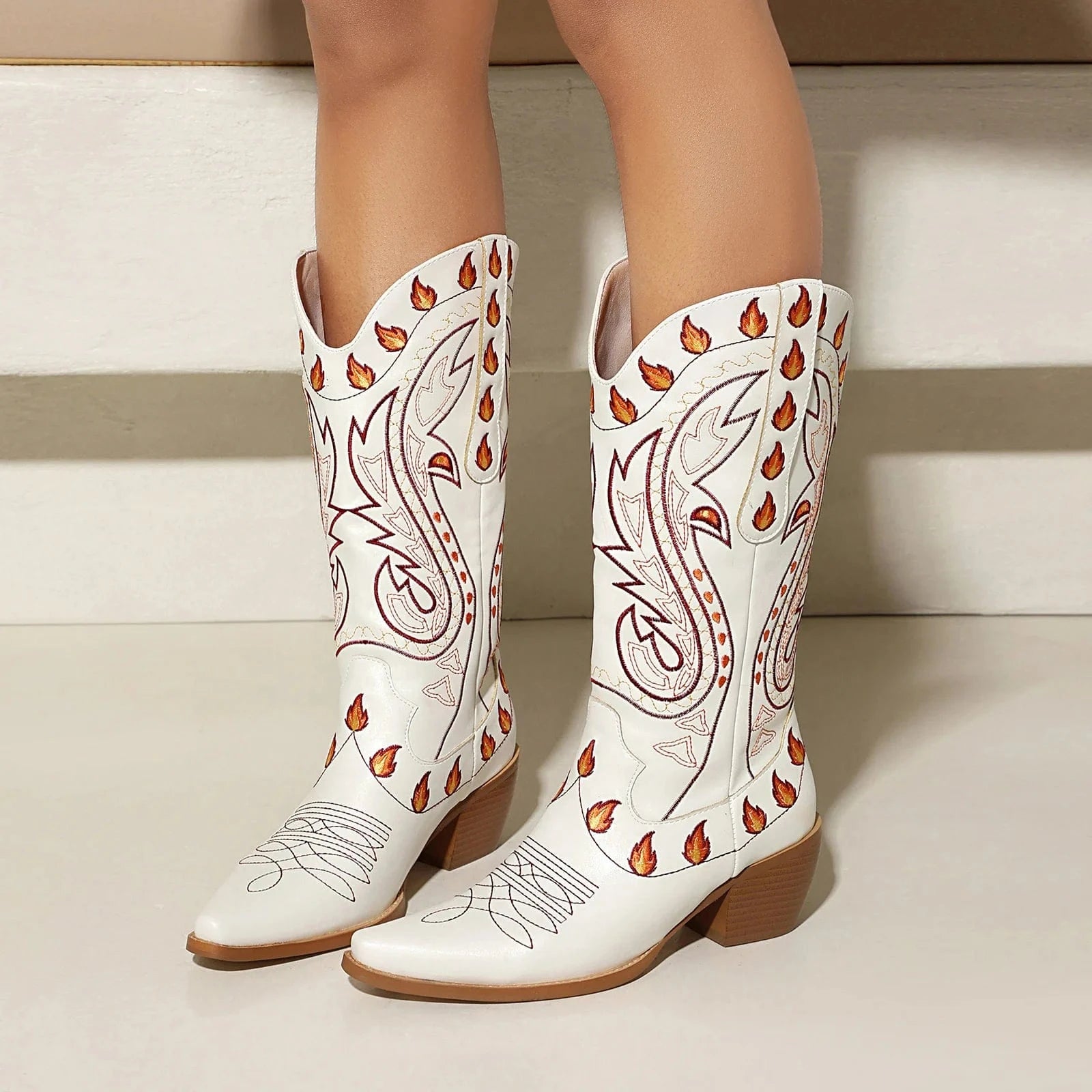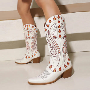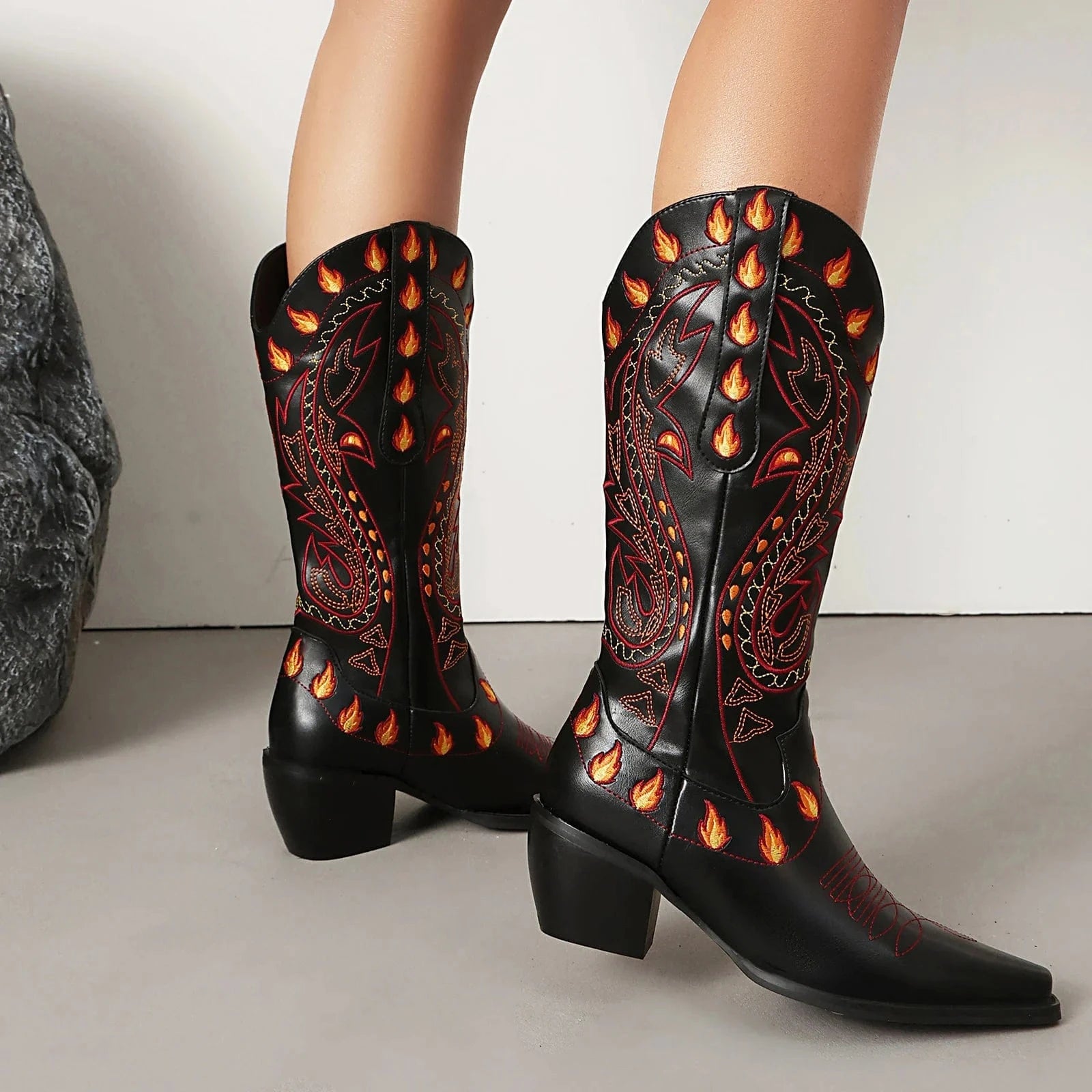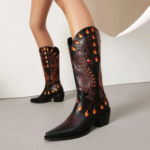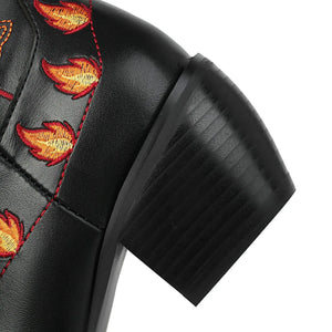 Låt din stil tala med våra cowboyboots med flammande broderier, tillgängliga i både svart och vitt. De kombinerar klassisk westernkänsla med en modern, självsäker look – perfekta för dig som vill ha både attityd och elegans. Bär dem till jeans, klänning eller kjol och skapa en outfit som andas frihet och karaktär.
