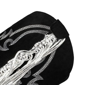 Upptäck ett par stövlar som fångar essensen av cowboystilen och förvandlar varje steg till ett statement. De svarta cowboystövlarna med fransar kombinerar tidlös västerncharm med en sofistikerad siluett – perfekta för dig som vill sticka ut med stil. Oavsett om du dansar, promenerar eller gör entré på festen, ger de här stövlarna dig självförtroende och attityd.