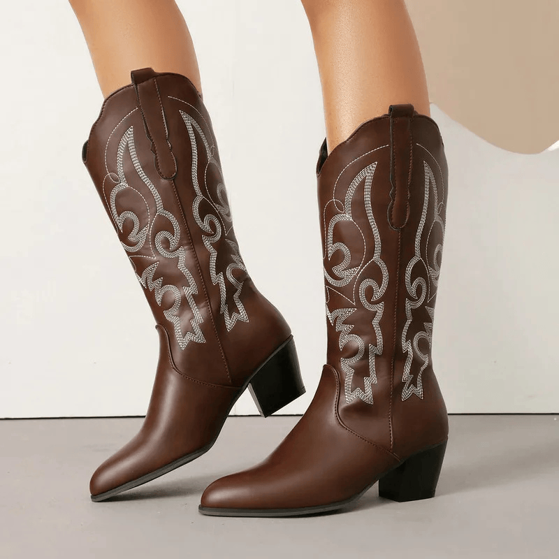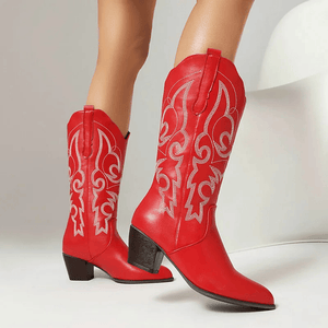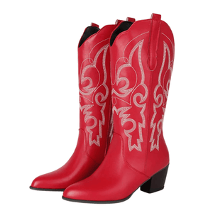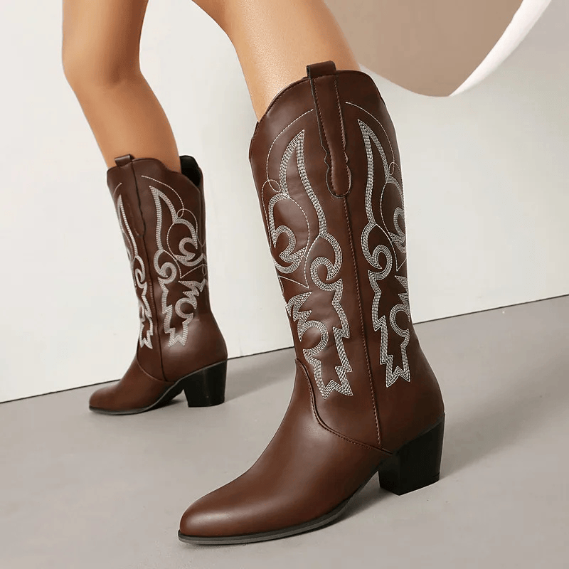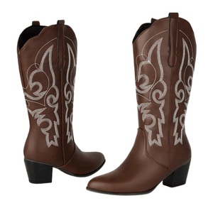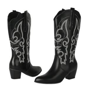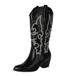 Dyk in i westernstilen med våra cowboyboots i skinnimitation – en perfekt balans mellan kraft och finess. De mjuka linjerna och de detaljerade broderierna ger en feminin touch till den klassiska cowboystilen, medan den stabila klacken på 5,5 cm ger dig både höjd och komfort. Oavsett om du bär dem till jeans, klänning eller kjol blir de snabbt din nya favorit i garderoben.