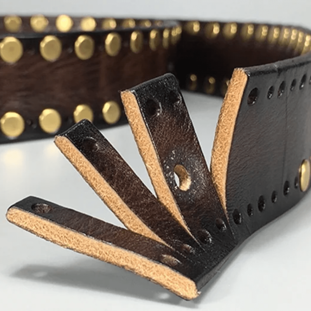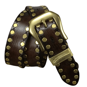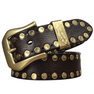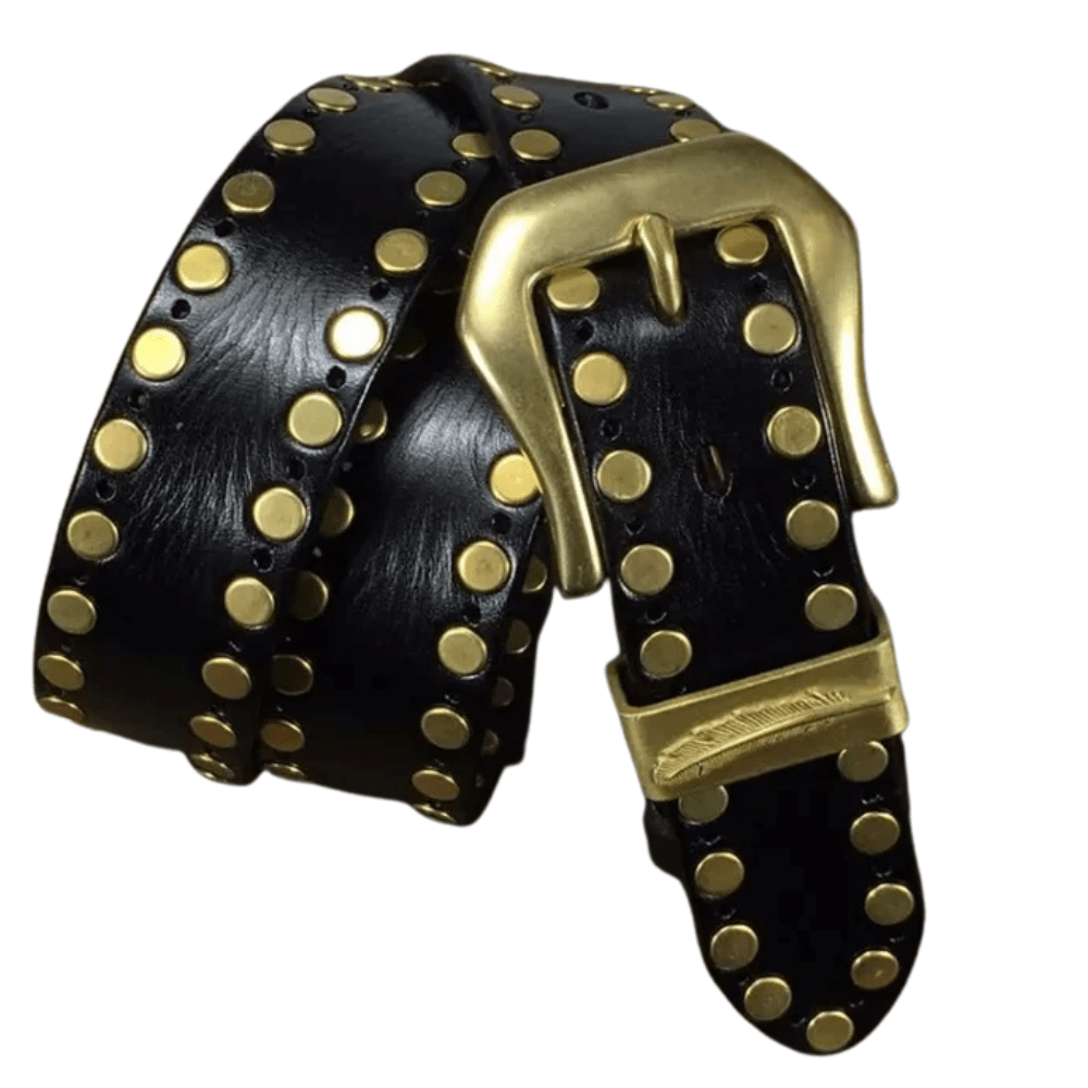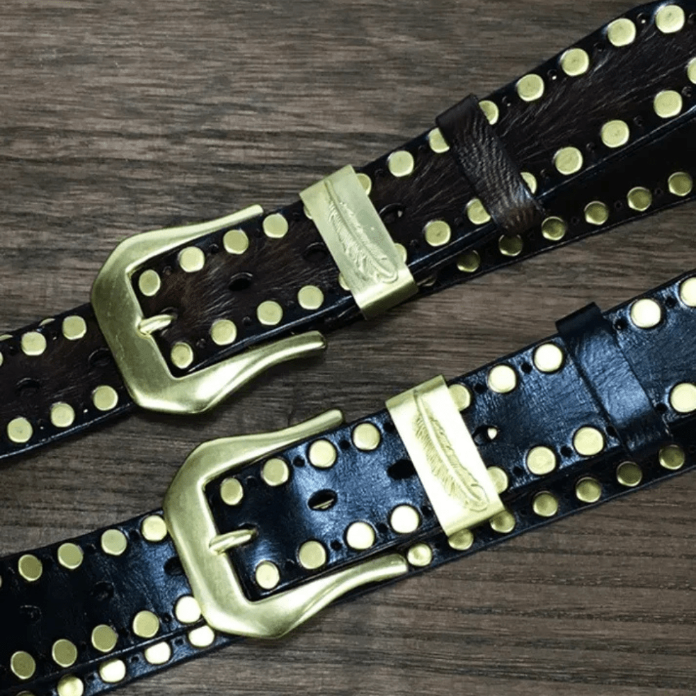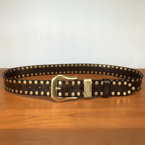 Det här bältet är gjort för dig som vill bära något med tyngd, karaktär och autenticitet. Ett cowboybälte i äkta kohud, dekorerat med stora mässingsfärgade nitar och en rejäl metallspänne. Perfekt till jeans, boots och en självsäker attityd.