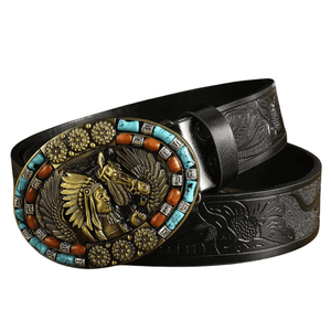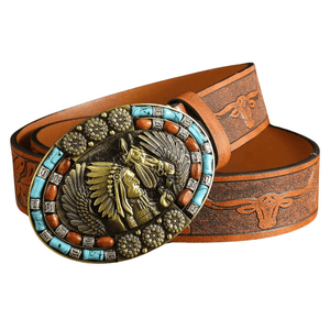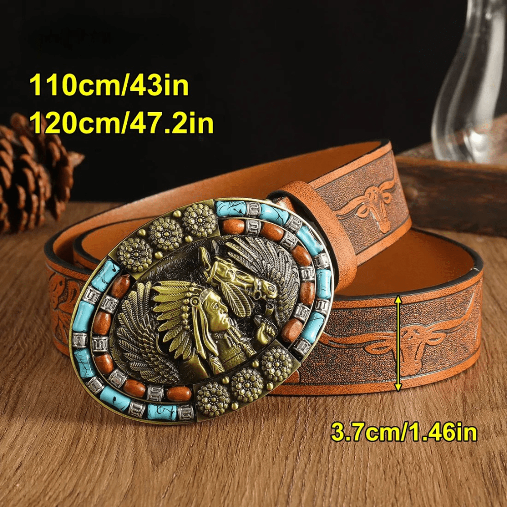 Det här bältet är inte bara ett tillbehör – det är ett statement. Med sina turkosa och bronsfärgade detaljer, gravyr i västerntema och en vintagelook är det perfekt för dig som vill sticka ut med självsäker stil.