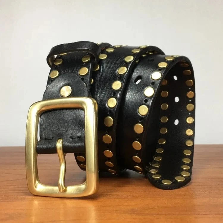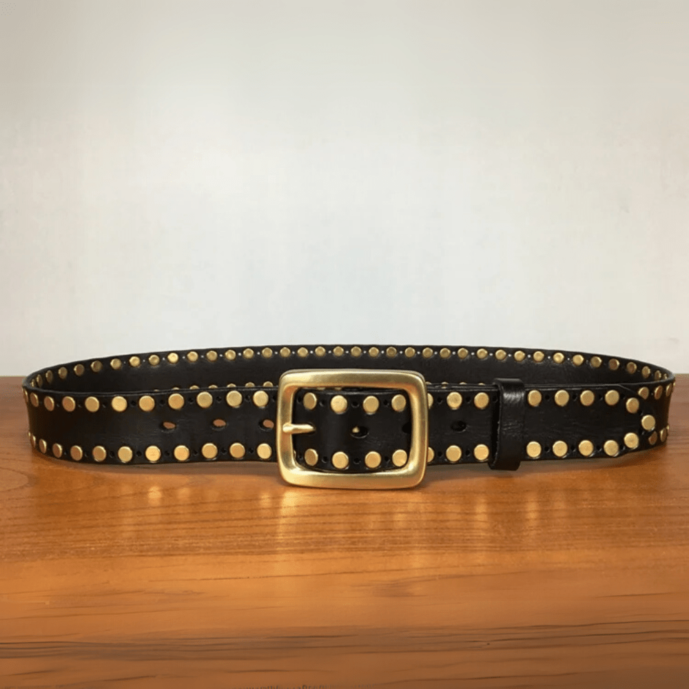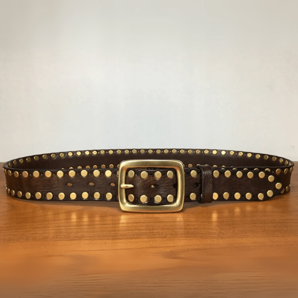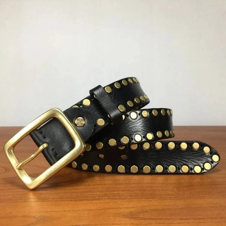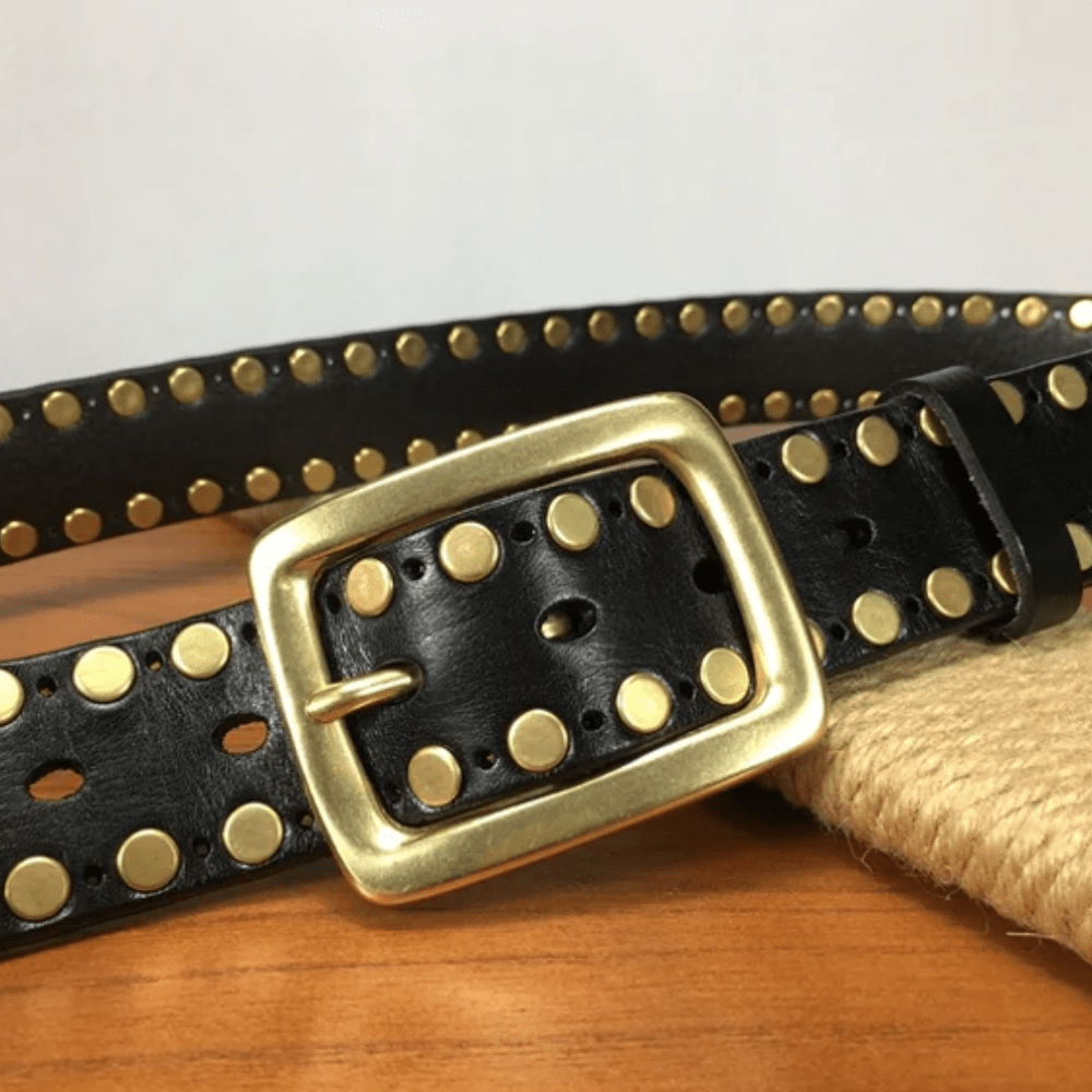 Bältet är klätt i rader av mässingsnitar som ger det en rå och rebellisk känsla. -