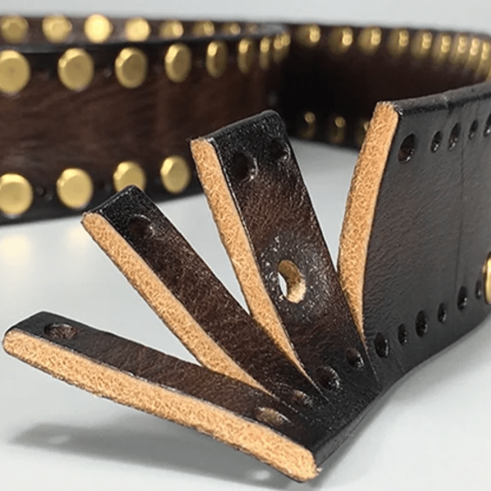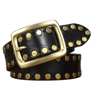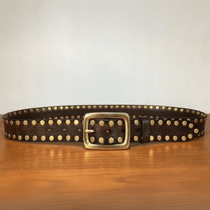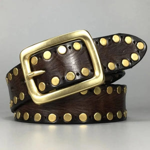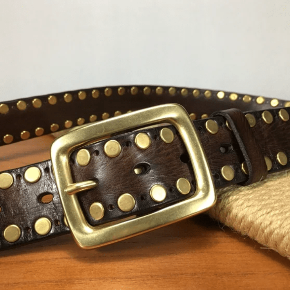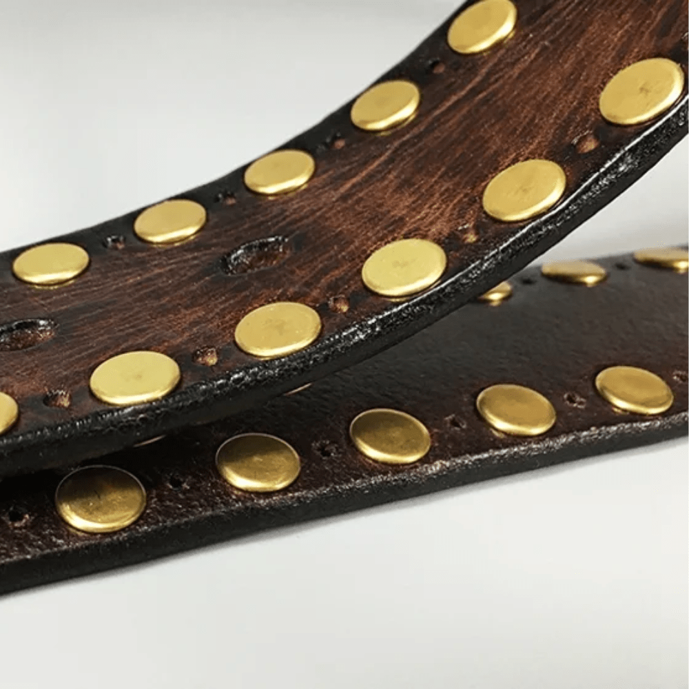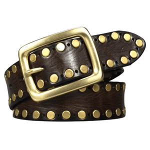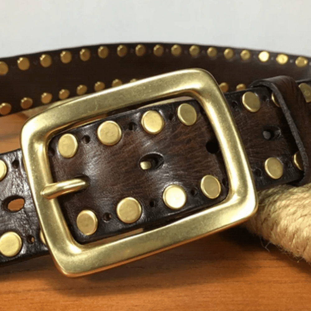 Bältet är klätt i rader av mässingsnitar som ger det en rå och rebellisk känsla. -