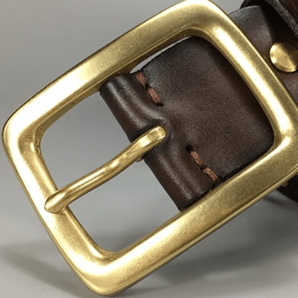 Den fyrkantiga formen och mjuka glansen i spännet kompletterar bältets starka design. -