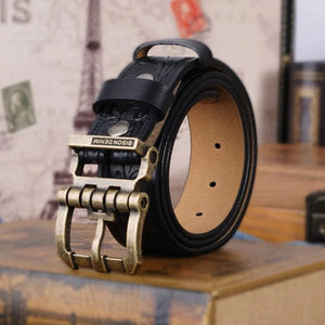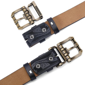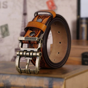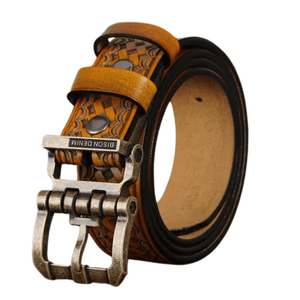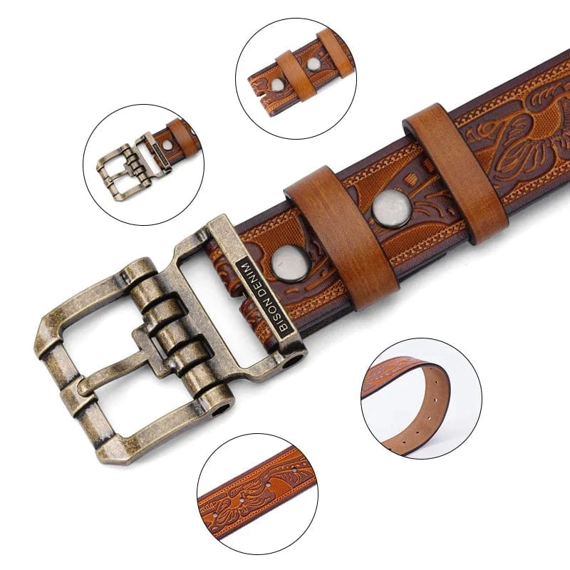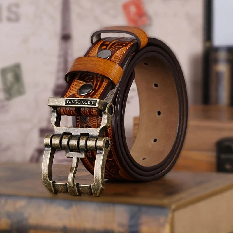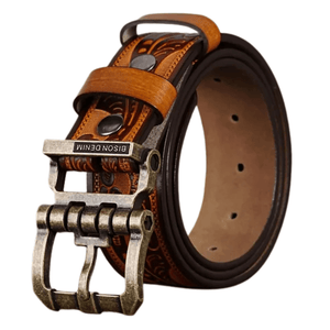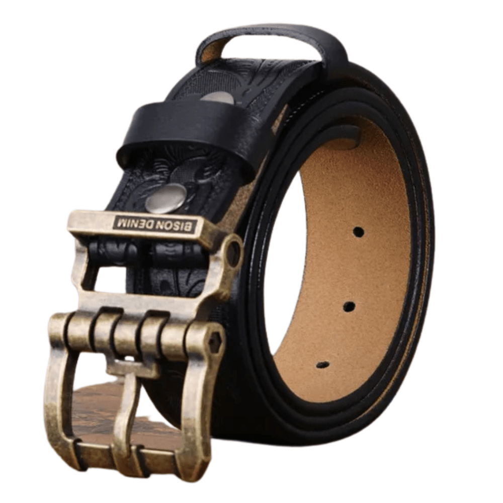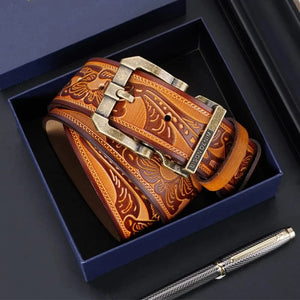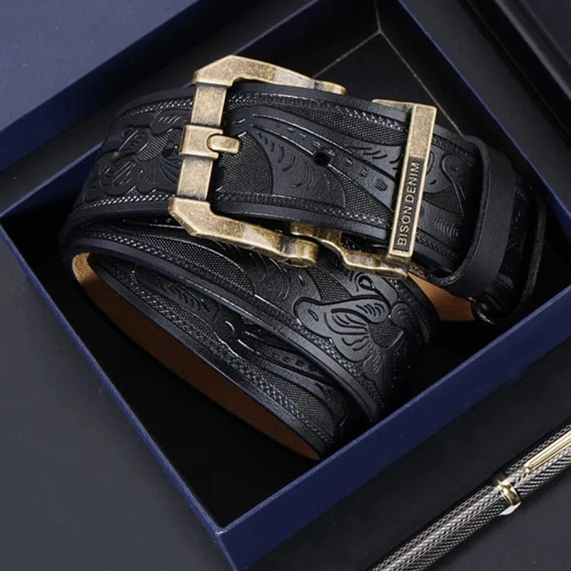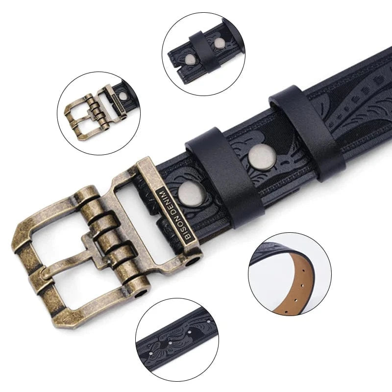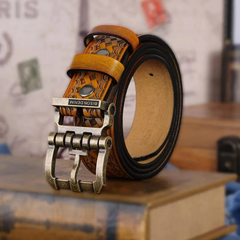 Bältet är tillverkat i äkta läder med distinkt präglat mönster och ett robust spänne i metall – ett perfekt val för dig som vill kombinera funktion och karaktär.