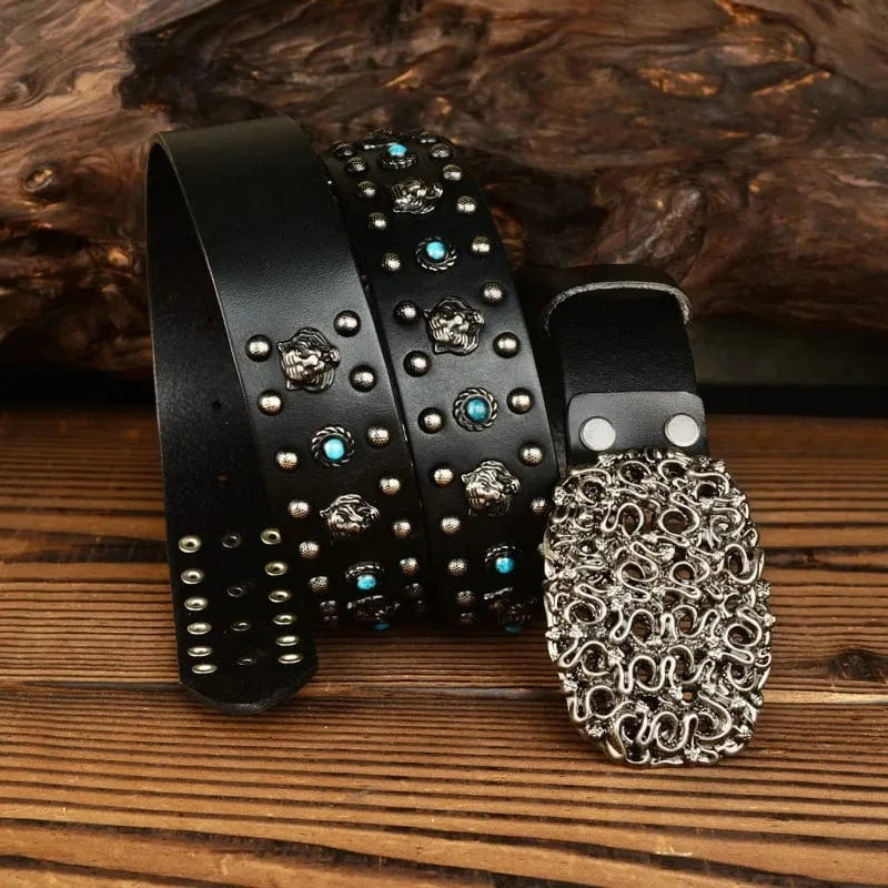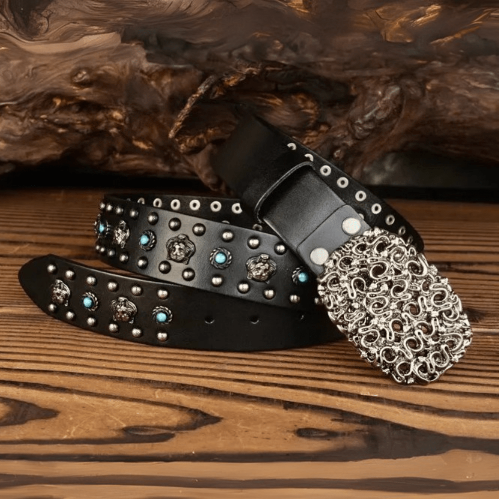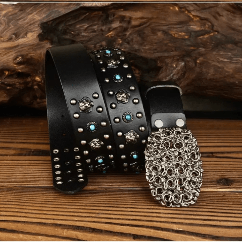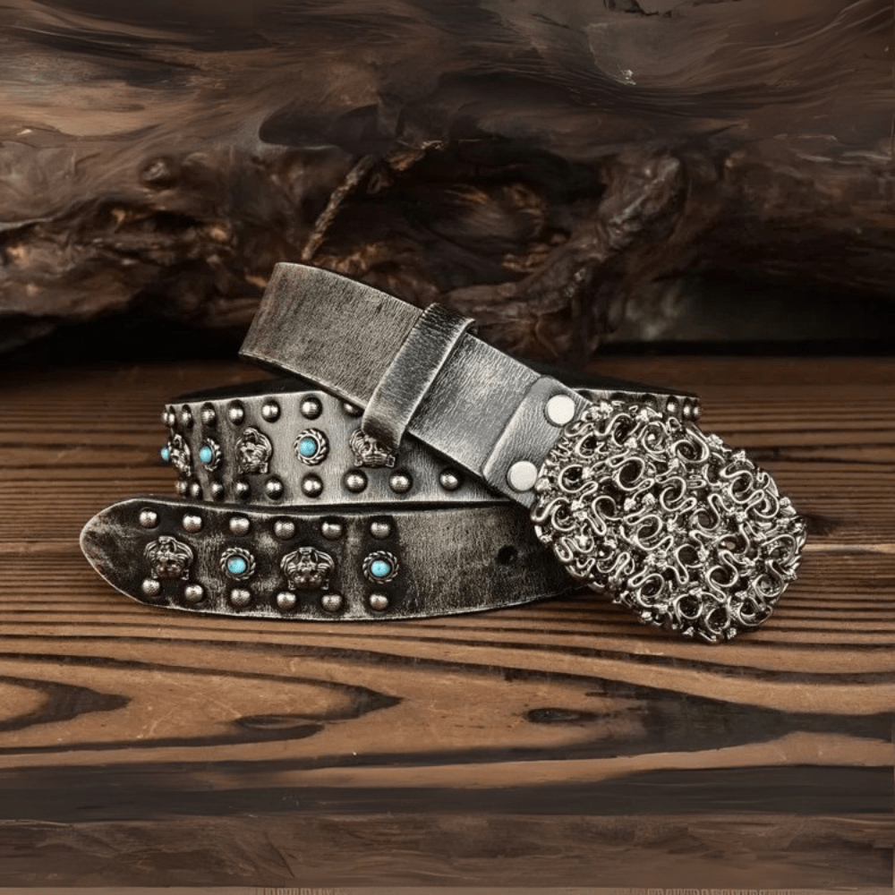 Bältet pryds av noggrant placerade metallornament som kombinerar rå maskulinitet med stilig design. -