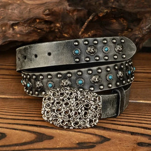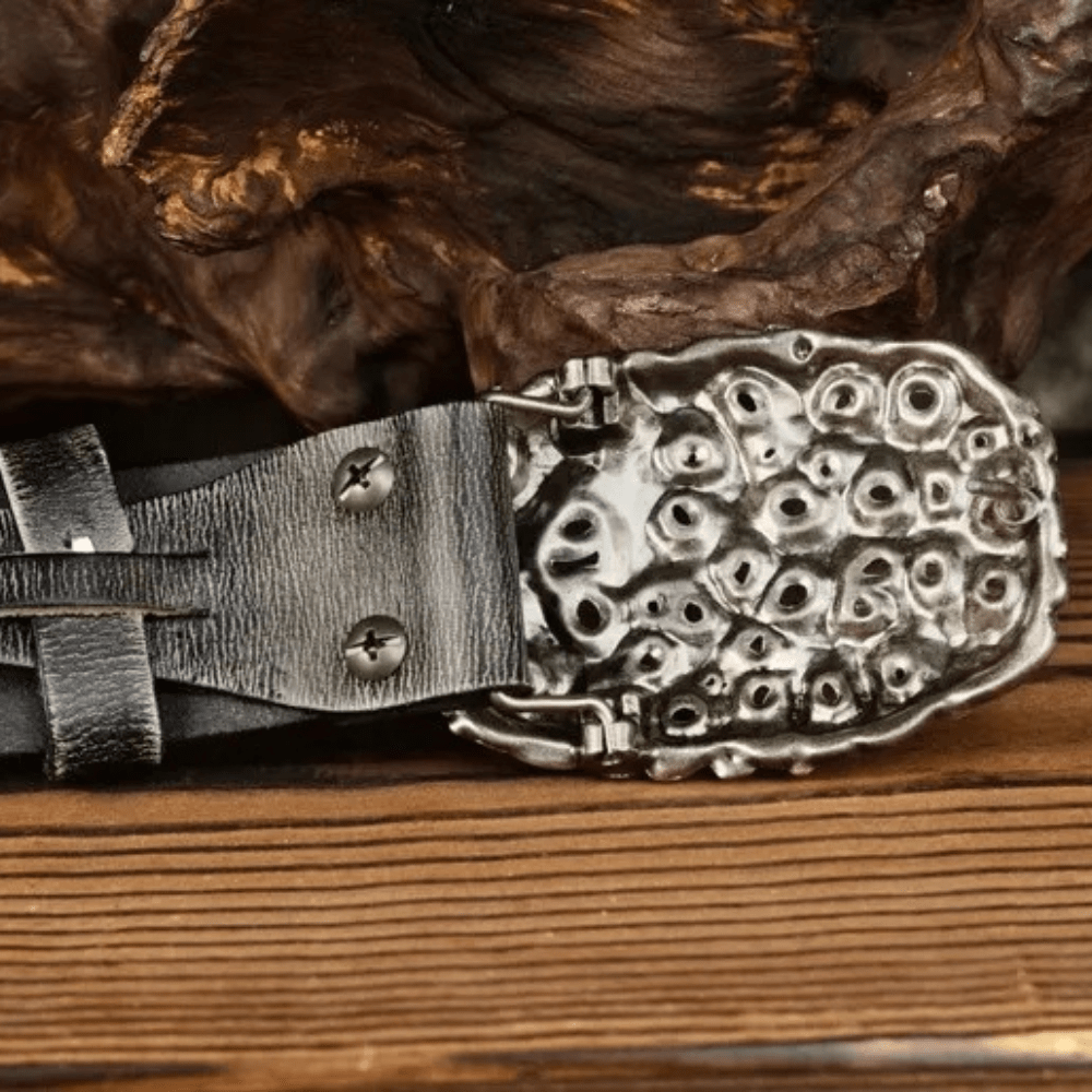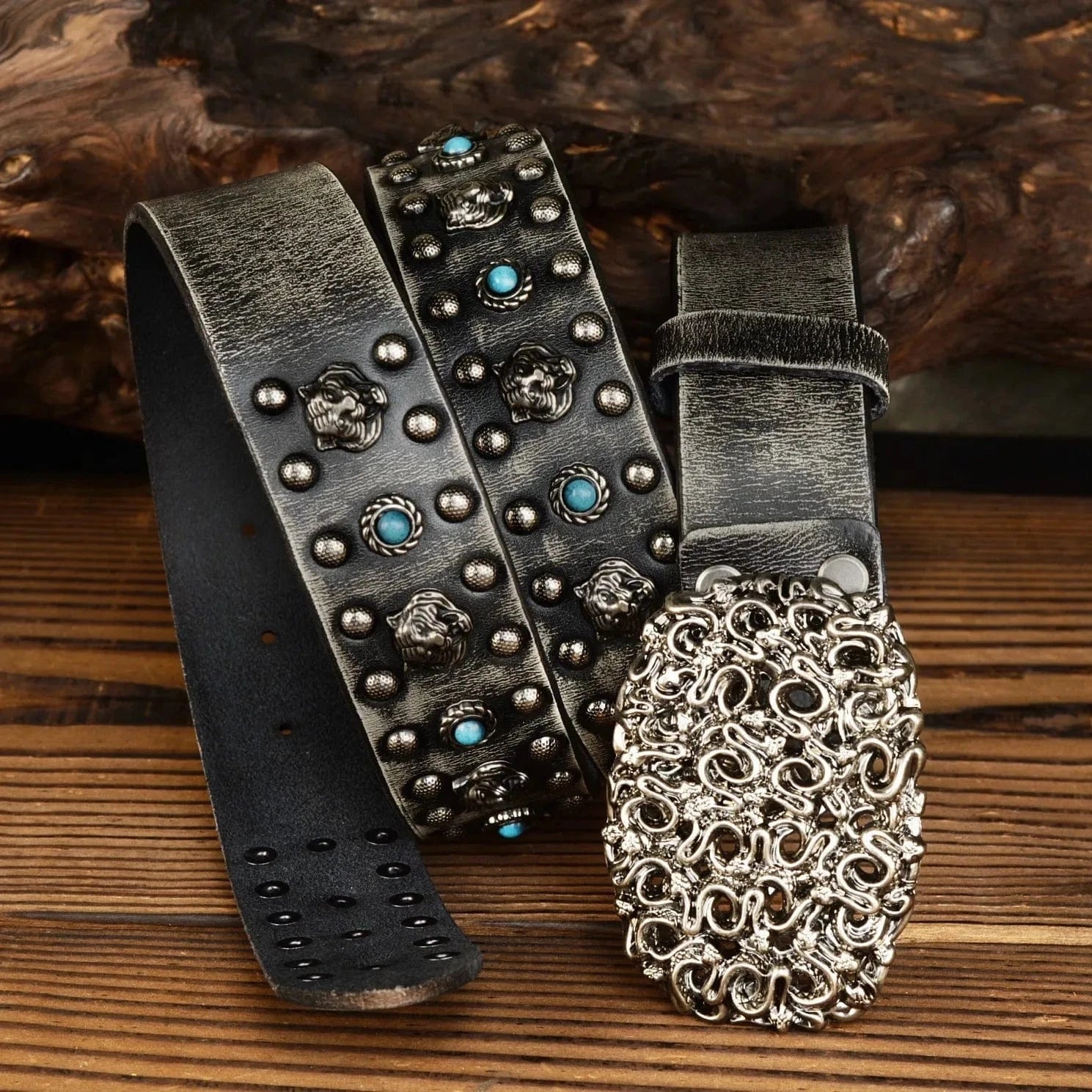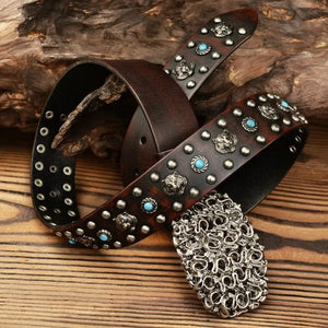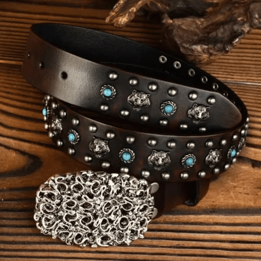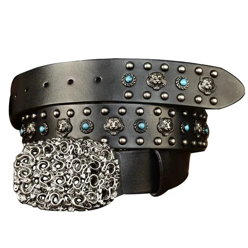 Bältet pryds av noggrant placerade metallornament som kombinerar rå maskulinitet med stilig design. -