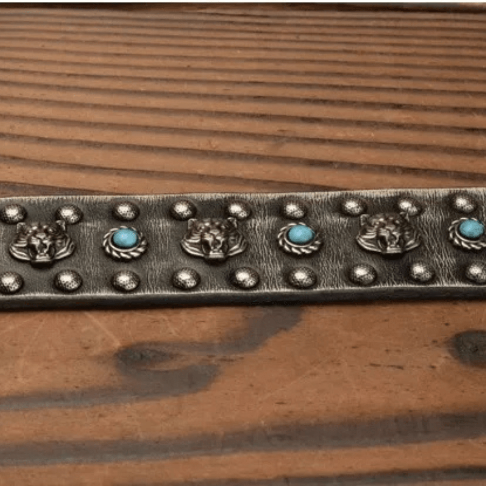 - Detaljer: Silverfärgade nitar, turkosa stenar, lejonhuvuden