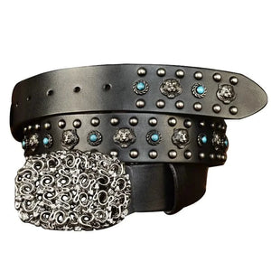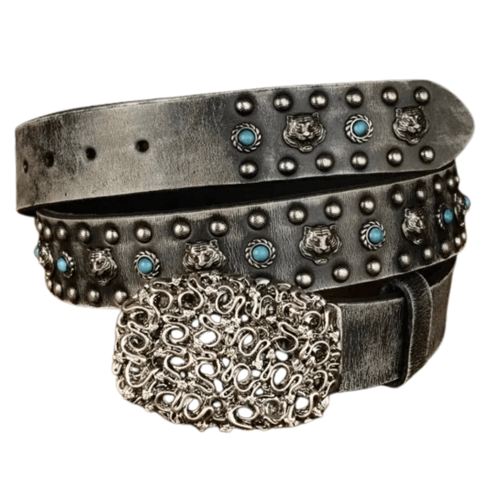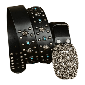 Ett westernbälte som fångar ögat – perfekt för dig som gillar att kombinera rå energi med elegant stil. Med sin robusta design, skinande turkosa stenar och intrikat dekorerat spänne förmedlar detta bälte självsäkerhet i varje detalj.