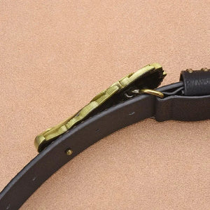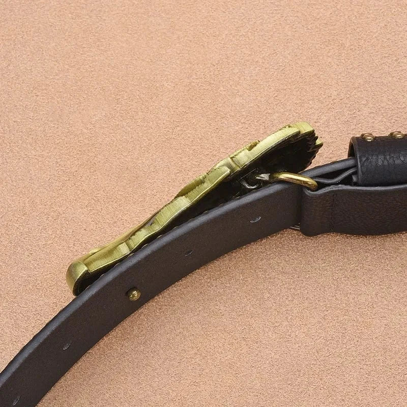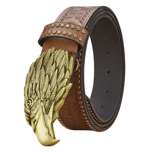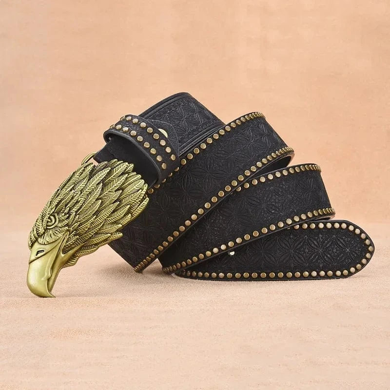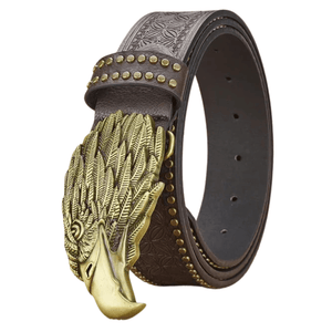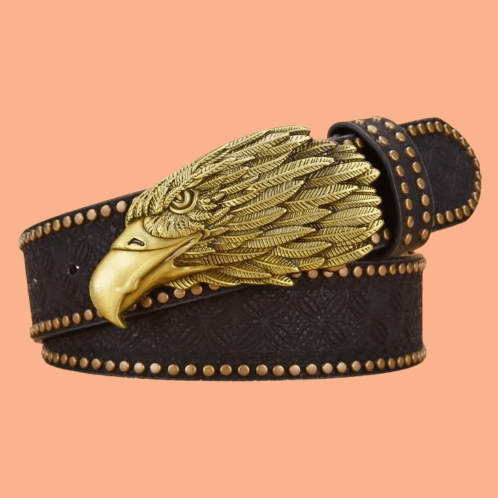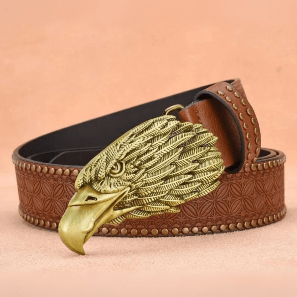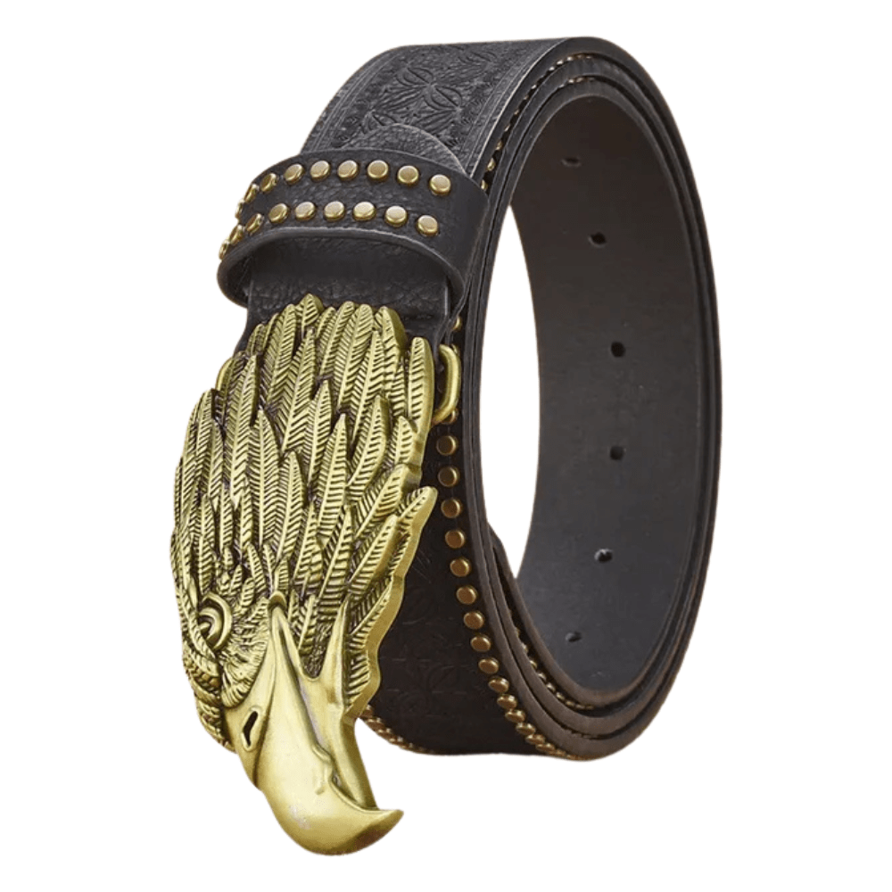 Den detaljerade örnbucklesen i mässingsfinish ger ett kraftfullt uttryck som andas frihet och styrka. -