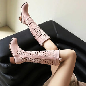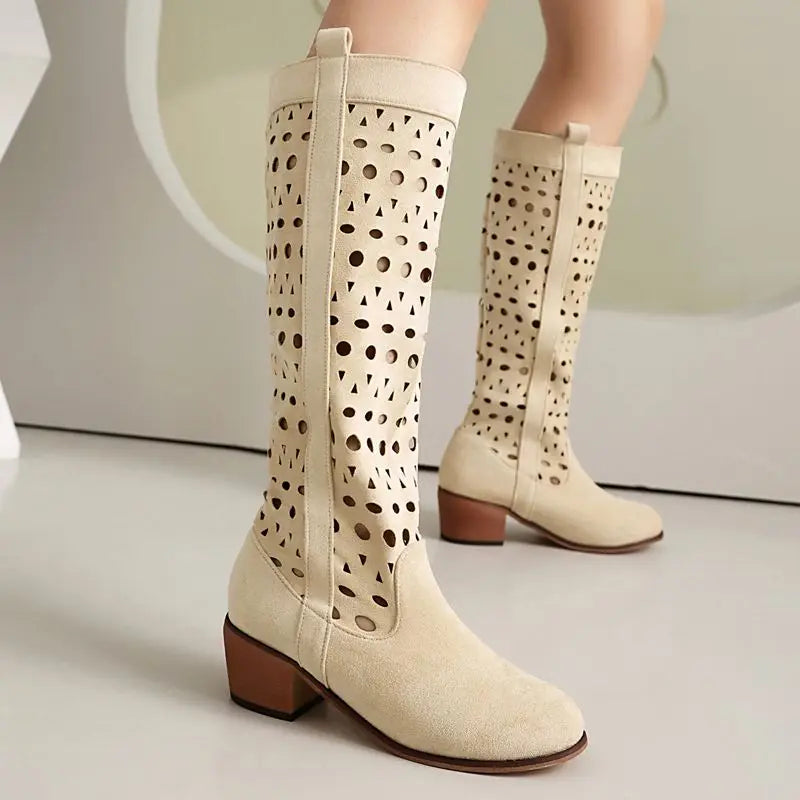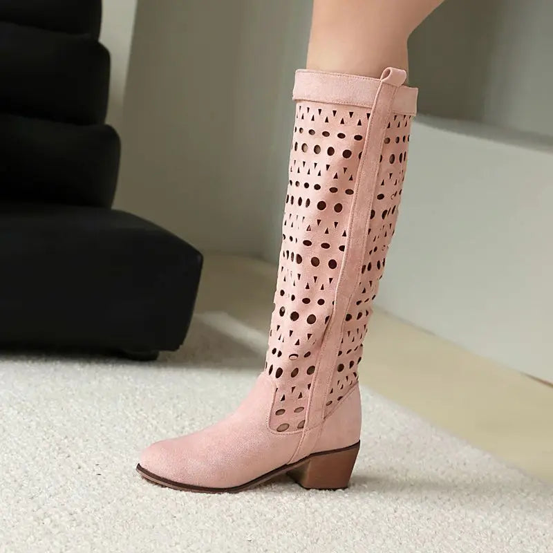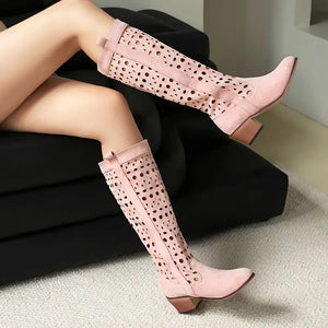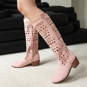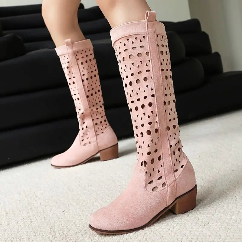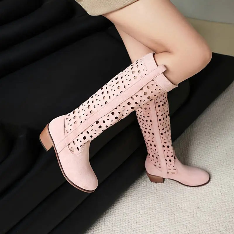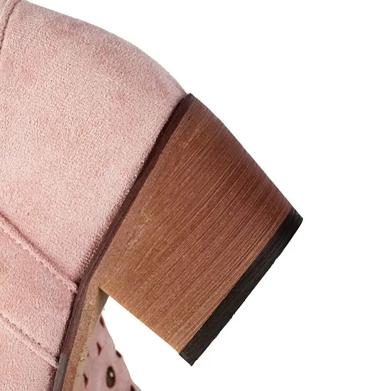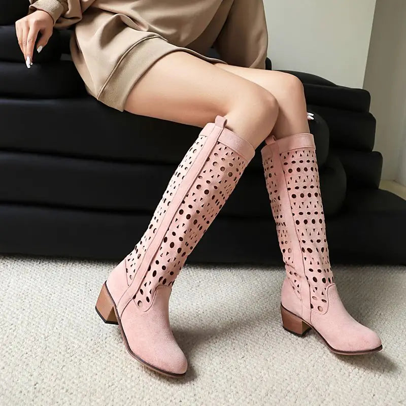 Föreställ dig hur du kliver ut på gatan, mjukt omfamnad av rosa mocka, med varje steg du tar inramat av det vackert utskurna mönstret i dessa höga cowboystövlar. Den fyrkantiga klacken ger dig en lätt lyft medan den rundade tån balanserar stilen mellan det feminina och det rustika. Perfekta för dig som vill sticka ut – utan att kompromissa med komforten.