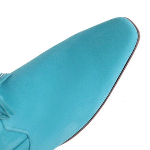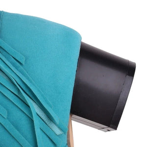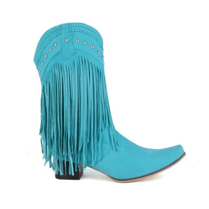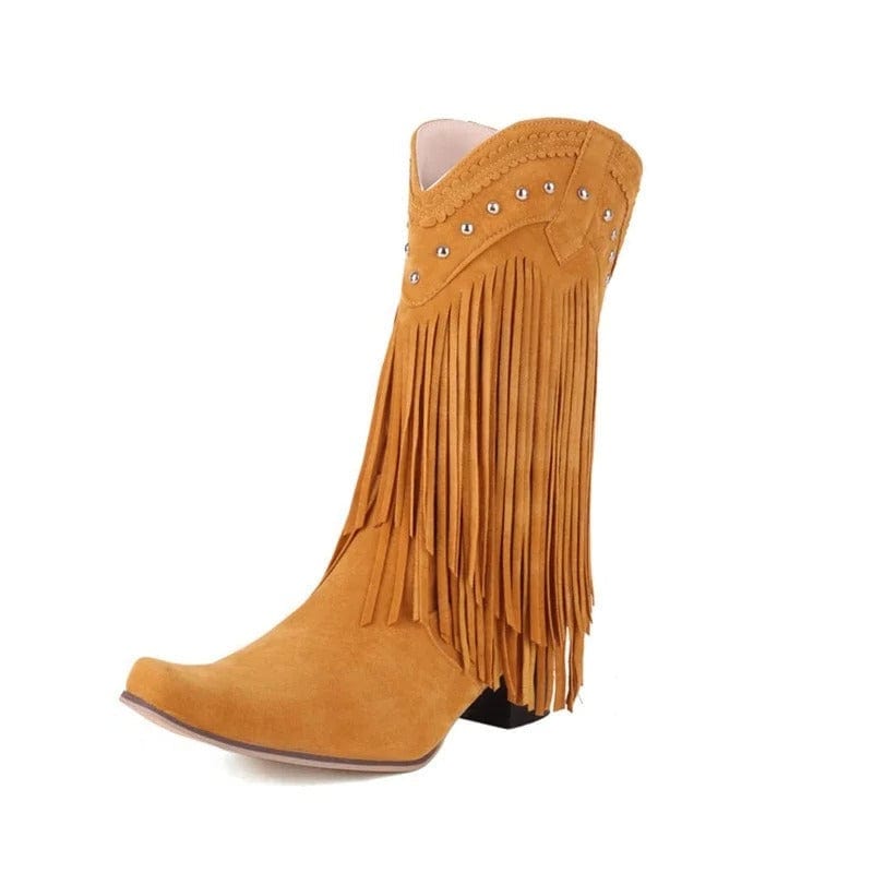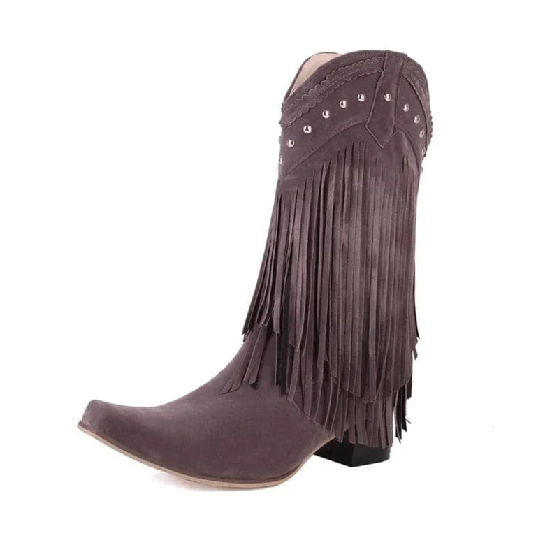 Låt din inre cowgirl ta plats med dessa ikoniska cowboyboots i mockalook. De långa fransarna rör sig med varje steg du tar, medan den spetsiga tån och den fyrkantiga klacken ger en perfekt balans mellan tradition och trend. Perfekta för både festivaler, vardag och kvällsäventyr – de här stövlarna låter dig sticka ut med självsäker stil.