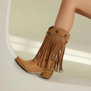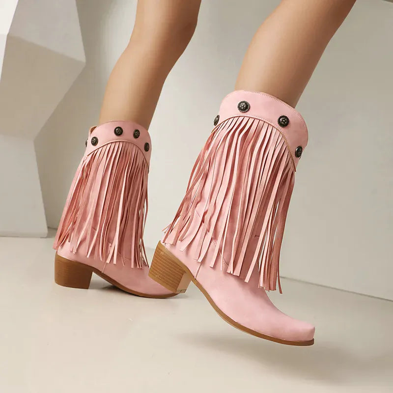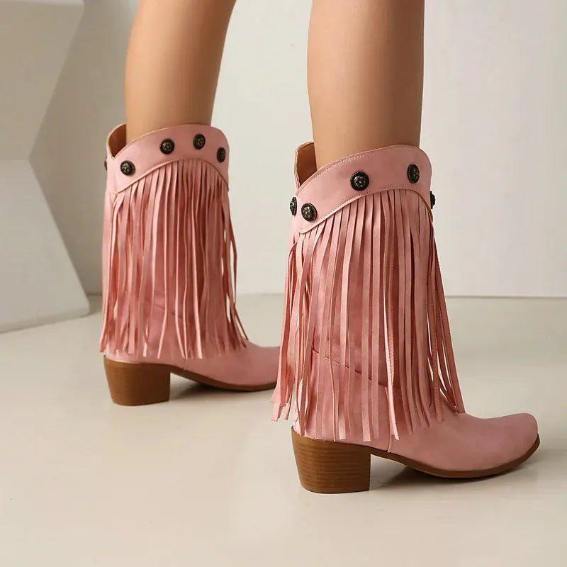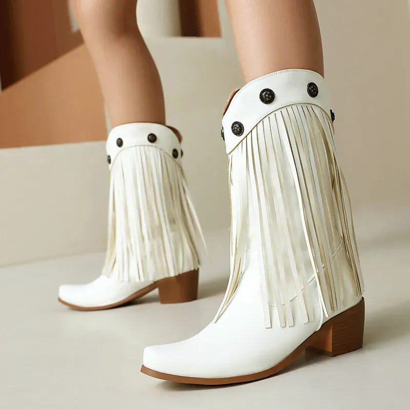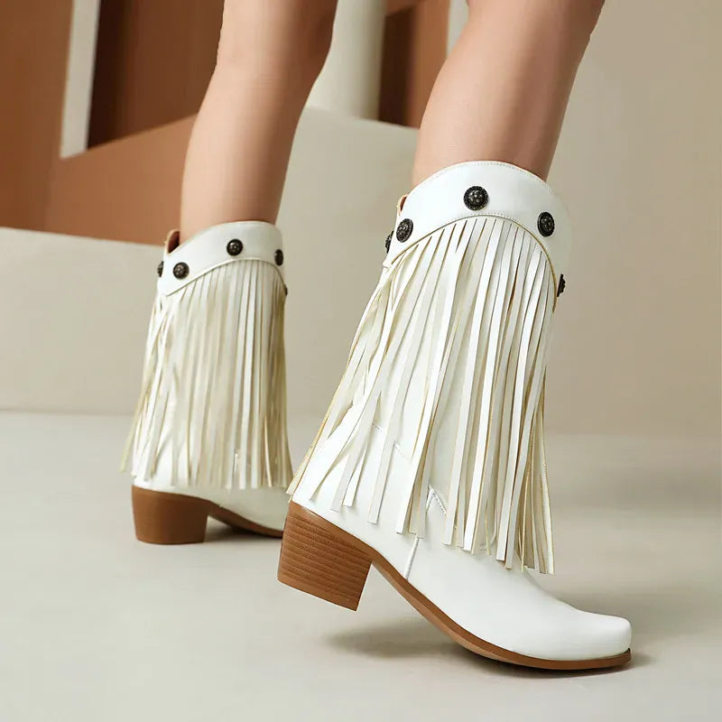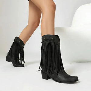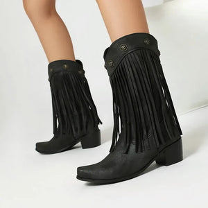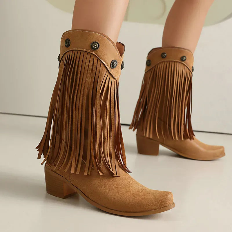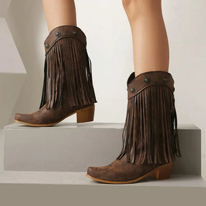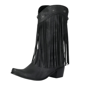 Upptäck ett par boots som tar dig raka vägen till prärien – eller till stadens mest stilsäkra gator. De här cowboybootsen kombinerar klassisk västernvibe med moderna detaljer som fransar och dekorativa nitar. En perfekt balans mellan djärv attityd och feminin elegans, designad för dig som älskar att uttrycka din stil utan kompromisser.