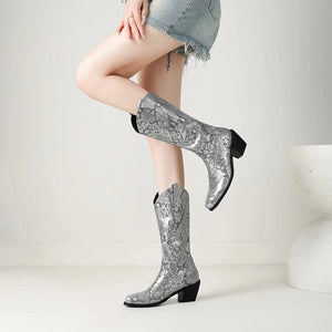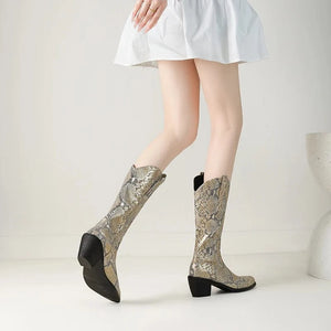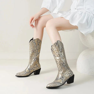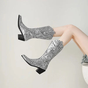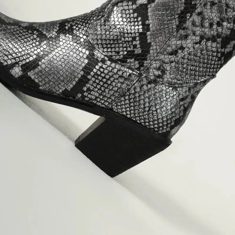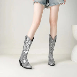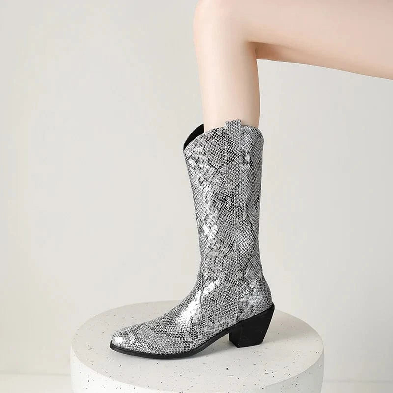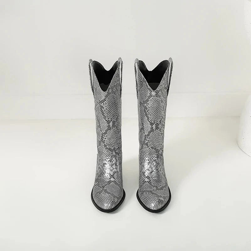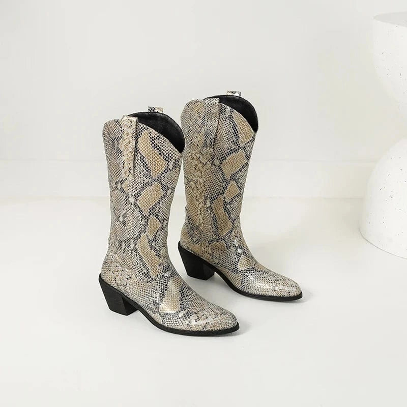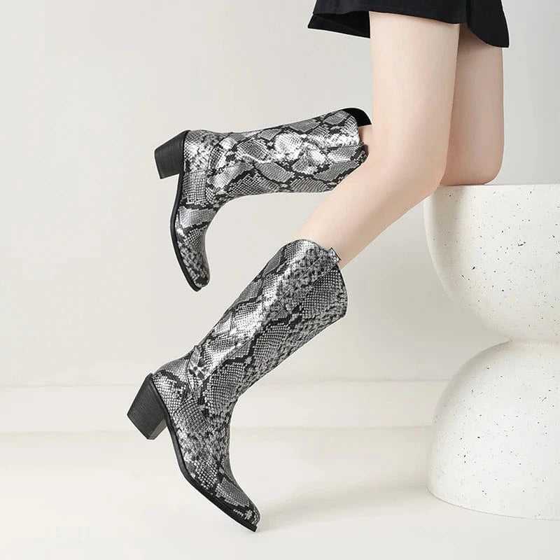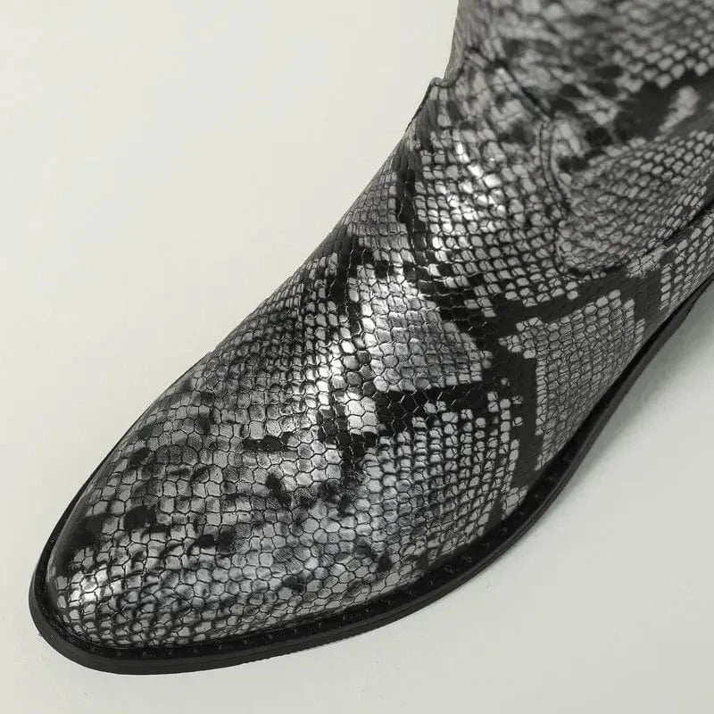 Låt din stil ta plats med dessa förföriskt mönstrade cowboyboots i ormskinnslook. Den glänsande ytan och den skulpturala siluetten ger varje steg en känsla av självförtroende och frihet. Oavsett om du bär dem till jeans, klänning eller kjol kommer de att förvandla din outfit till något helt oförglömligt.