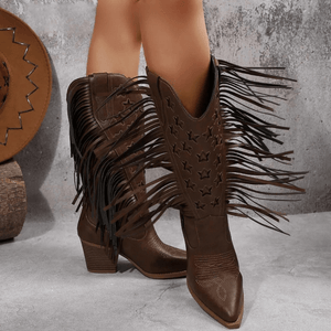 Väck din inre cowgirl till liv med dessa cowboyboots som inte kompromissar med vare sig stil eller komfort. Med vackra stjärnbroderier och långa fransar som följer varje steg, är det här skon för dig som vill sticka ut – från festival till vardag. Den höga klacken lyfter inte bara din hållning, utan hela din look.